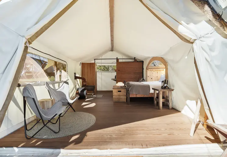 Je komt aan op de glamping. Geniet van de voordelen van kamperen, zoals de spectaculaire locatie, midden in de natuur! Daarnaast geniet je van veel comfort in de luxe tenten. Het beste van twee werelden dus!