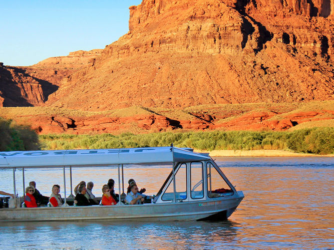 Ga mee voor een jetboattour waar je gids je mee naar beneden neemt op een rustig watertraject van de Colorado-rivier. Geniet van de schoonheid van de canyons terwijl je het landschap achter elke bocht van de rivier verkent. Stel tijdens de tocht vragen aan je gids terwijl hij of zij de geologie en geschiedenis van Moab, Utah en de Colorado-rivier uitlegt. Je hoort over films en commercials die hie...