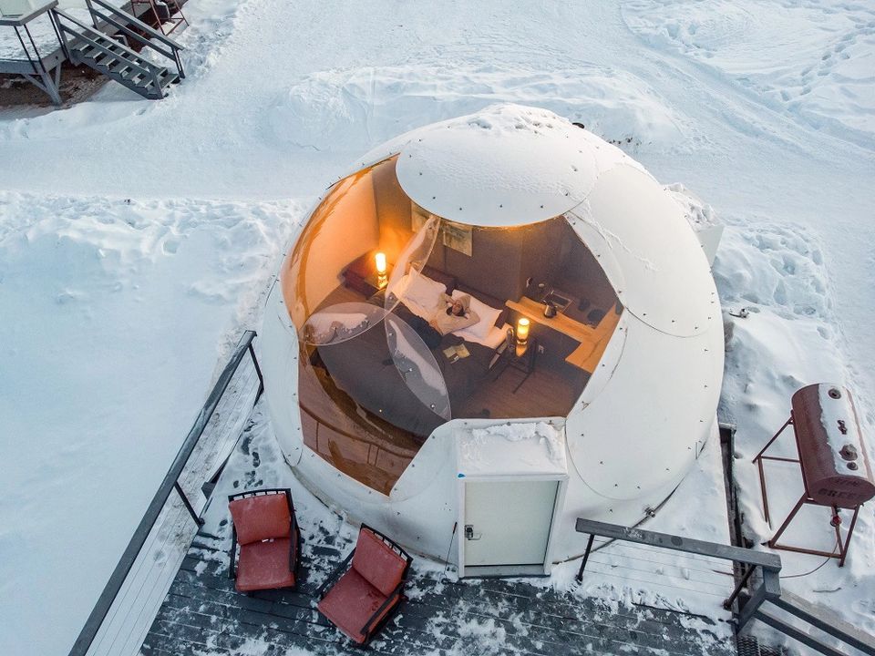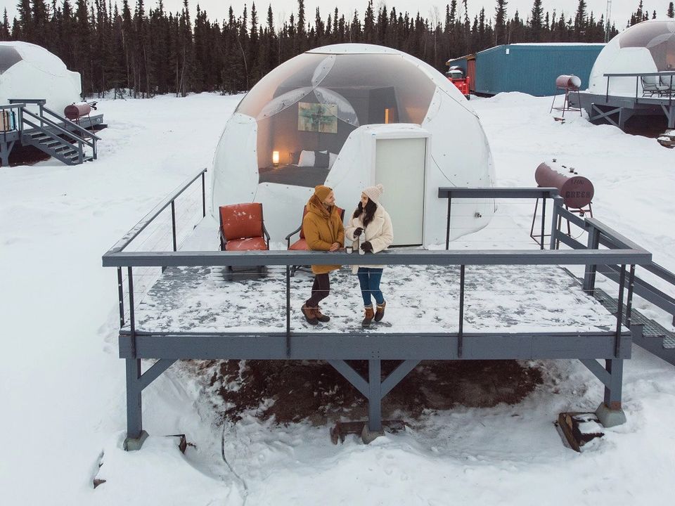 Noorderlicht boven een dome van Borealis Basecamp, nabij Fairbanks, Alaska