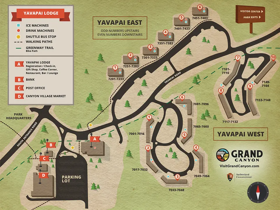 De kamers zijn verdeeld over Yavapai East en West. In Yavapai East bevinden zich zes gebouwen, twee verdiepingen hoog. Alle kamers zijn voorzien van een eigen badkamer, airconditioning, een kleine koelkast, koffie- en theefaciliteiten, een televisie, strijkfaciliteiten, een kluisje en een haardroger. Er kan in deze kamers een extra bed bijgezet worden.