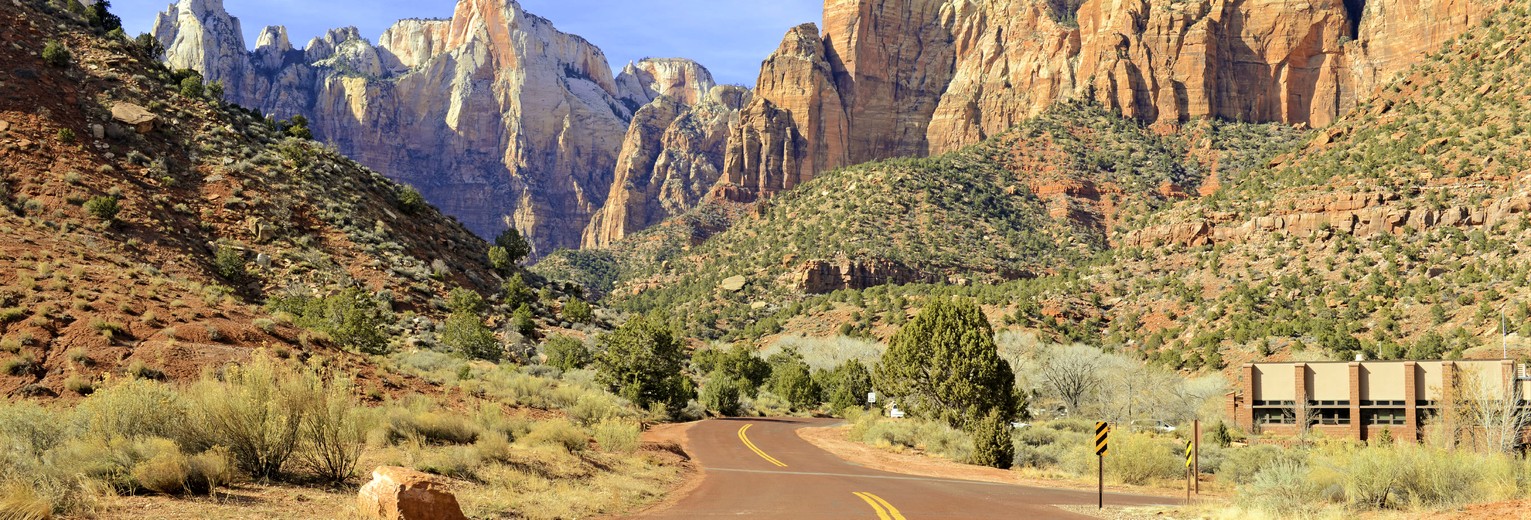 De Zion Canyon Scenic Drive is de hoofdweg die dwars door het park loopt en je naar de verschillende bezienswaardigheden en startpunten van wandelroutes brengt. Tussen maart en oktober rijden er gratis shuttlebussen; auto’s zijn dan verboden.