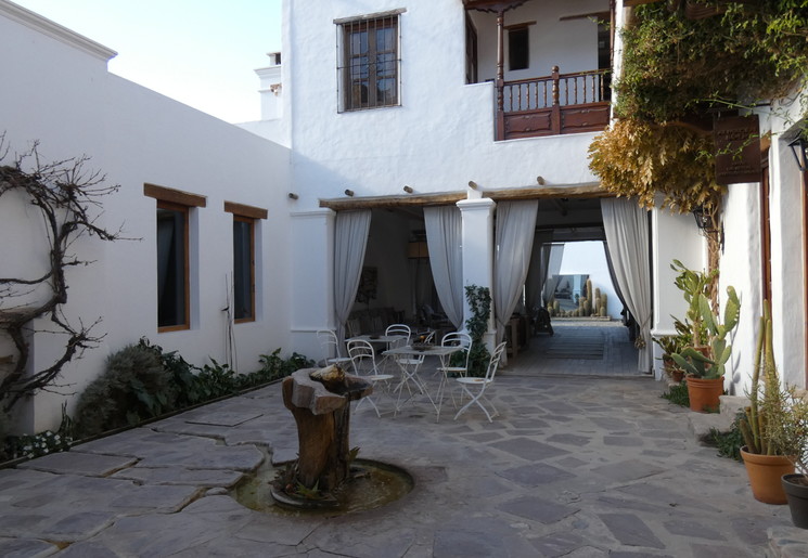 Een prachtig lang en smal gebouw, in de stijl van een oud landhuis. Je komt binnen via een knusse lounge met diverse zitjes. Daarachter is een binnenplaats met schaduwrijke zitplekken. Voor meer privacy is daarachter nog een cactustuin met twee zitjes. De meeste kamers zijn op de eerste verdieping. Ze liggen aan een galerij die uitkijkt op de binnenplaats. Enkele liggen beneden aan de binnentuin. Er zijn dertien kamers. De kamers zijn vrij klein, maar alles wat je nodig hebt is er. Verwarming, een kluisje, een haardroger en een badkamer met een inloopdouche. Op de vloer liggen plavuizen. Sommige kamers kijken uit op de bergen en in de verte is zelfs de begraafplaats te zien. Het hotel noemt zichzelf een boutiquehotel. Dat gaat zeker op voor de architectuur en de inrichting van de algemene ruimtes. De kamers zijn net iets te eenvoudig om “boutique” te zijn, maar de inrichting is wel leuk. Sommige muren zijn met jute bekleed en er hangen sepia foto’s van de omgeving. Een nachtkastje met marmeren blad past bij de badkamer, waar de hippe wasbak ook op een marmeren blad staat. Het water van de douche komt op planken terecht. In de kamer en in de badkamer hangen designradiatoren.