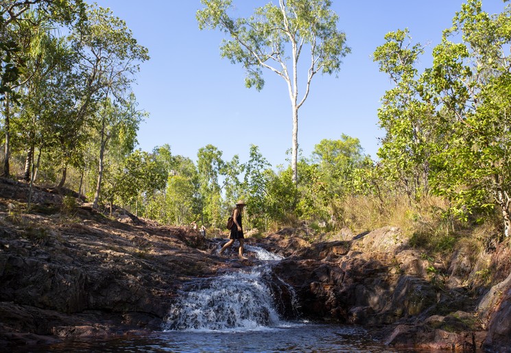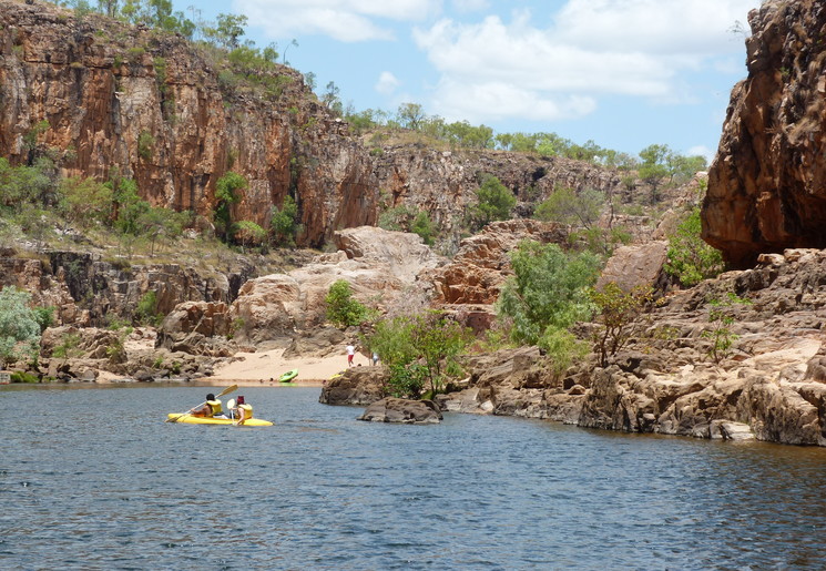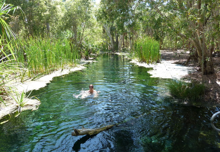 Ik rijd weer even een stukje terug noordwaarts, want ik wil Litchfield National Park niet overslaan. En al snel volgt een derde National Park: Katherine Gorge, door de locals Nitmiluk genoemd. De wegen die de parken met elkaar verbinden zijn vooral… leeg. Oneindig. Er is geen auto te zien. De zon brandt op het zich eindeloos uitstrekkende asfalt en toch is het geen seconde saai. Als ik een kopje koffie wil, zet ik de camper even stil langs de kant van de weg en geniet van het landschap, terwijl ik in de pantry mijn eten en drinken bereid. In de nationale parken zijn diverse campings om uit te kiezen. Elke nacht weer een mooi plekje in de natuur onder de sterrenhemel of soms met iets meer luxe zoals een zwembad om even op te frissen. Maar nog leuker zijn vandaag de natuurlijke warmwaterbronnen in de omgeving van Mataranka. Het was bedoeld als een tussenstopje in de ochtend, maar omdat ik toch geen vaste route had en geen hotels geboekt had, besloot ik nog even op dit paradijselijke plekje te blijven. Ook dat is het voordeel van reizen met een camper.
