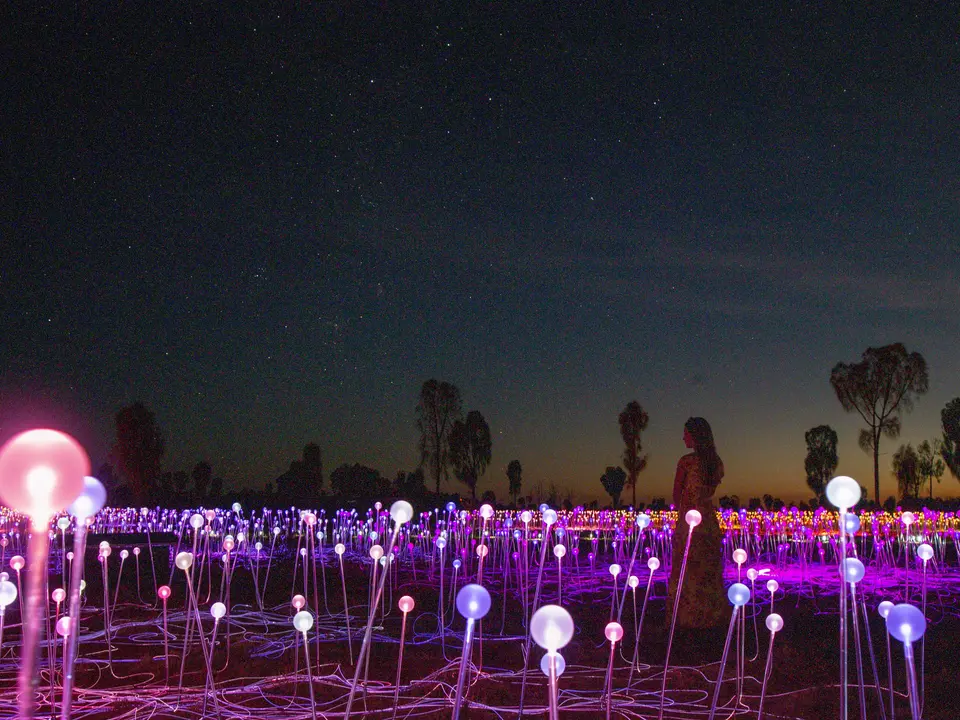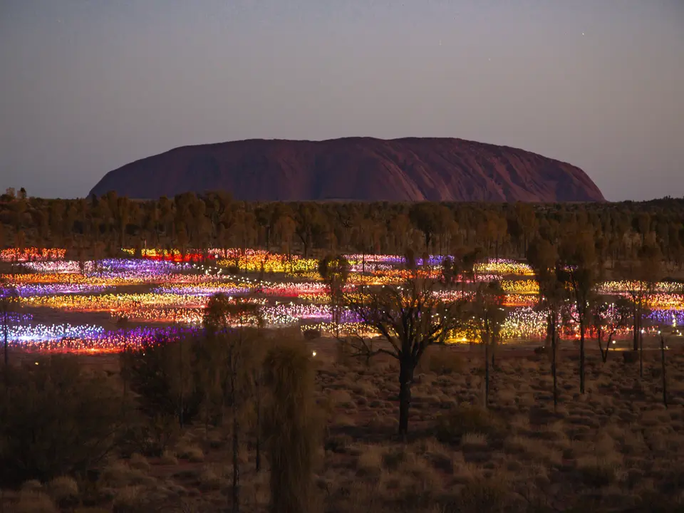 Vanavond bewonder je het kunstwerk vol met lichtjes van kunstenaar Bruce Munro. Terwijl het steeds donkerder wordt in de outback, beginnen de 50.000 lichtjes van het Field of Light kunstwerk te kleuren. De tentoonstelling in Pitjantjatjara, met de toepasselijke naam Tili Wiru Tjuta Nyakutjaku, ook wel “kijken naar veel mooie lichtjes” genoemd, is Munro’s grootste werk tot nu toe. Het kunstwerk is overweldigend in omvang, namelijk meer dan 7 voetbalvelden groot. Wandel op je eigen tempo door deze fantasietuin midden in de woestijn met duizenden lichtjes in een spectrum van oker, diep violet, blauw en zacht wit.