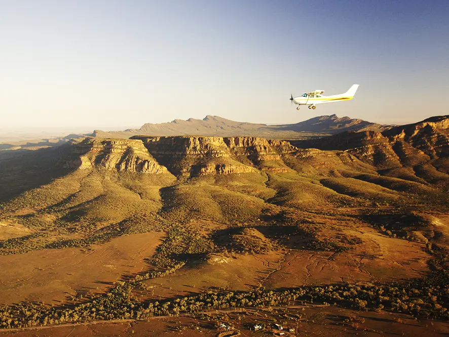 Vandaag verken je het oeroude landschap van de Flinders Ranges vanuit de lucht! Na een korte introductie vertrek je vanaf de landingsbaan bij het resort met een klein toestel van Wrights Air. De 20 minuten durende panoramische vlucht biedt een fantastisch uitzicht op de omgeving, waar je de Wilpena Pound vanuit de lucht bewondert. Het resort is genesteld tussen de River Red Gums vlak bij de Pound Gap en zie je ook van bovenaf. Vervolgens vlieg je over de Elder Range, Edeowie Gorge, Lake Torrens, de Heysen Range en St. Mary Peak.