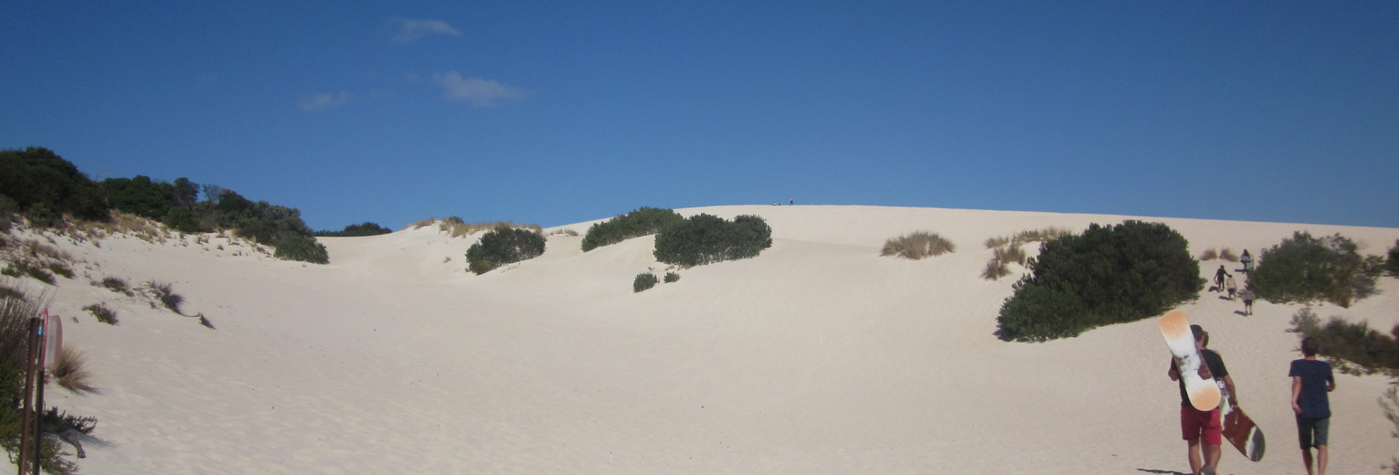 Spannend is het te sandboarden in Little Desert. Dit is een hoge natuurlijke zandduin tussen de eucalyptusbossen, waar je op een sandboard van de zandduinen af kunt glijden.