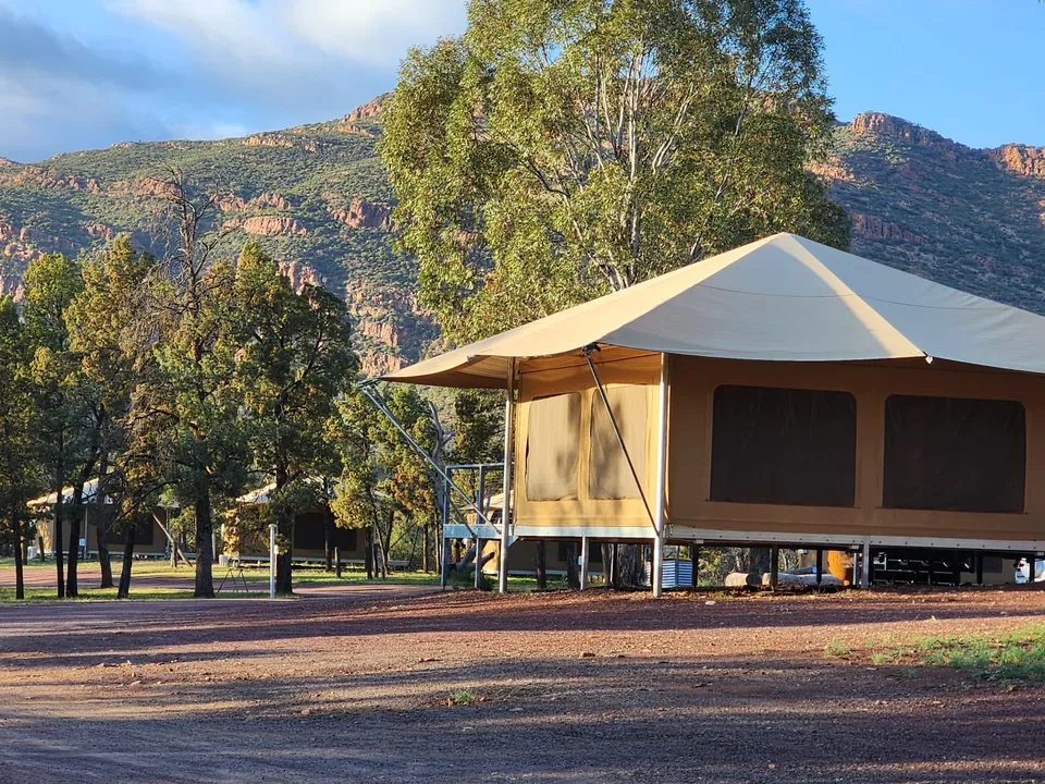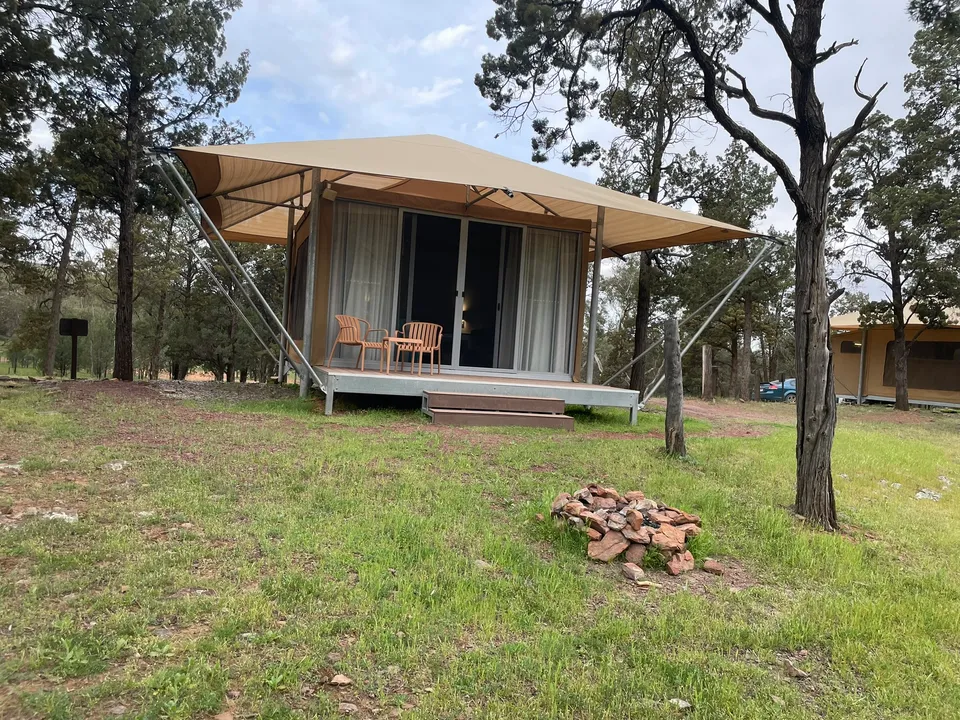 Wij zijn zelf bijzonder gecharmeerd van de glampingtenten. De glamping tenten liggen aan de rand van de camping, midden in de natuur met vrij uitzicht op glooiende weides met kangoeroes en de bergen. De tenten zij voorzien van een vlonderterras met 2 stoelen. Een grote schuifpui zorgt voor een prachtig uitzicht vanuit de tent. Verder is er een kingsize bed of twee eenpersoonsbedden, airconditioning, koffie- en theefaciliteiten, kluisje, kleine koelkast en een badkamer met douche en toilet. De glampingtenten bieden uenieke natuurbeleving in alle comfort.