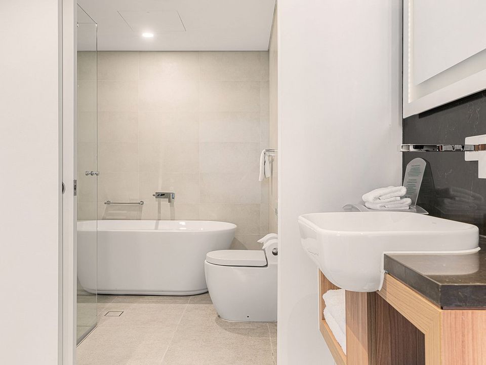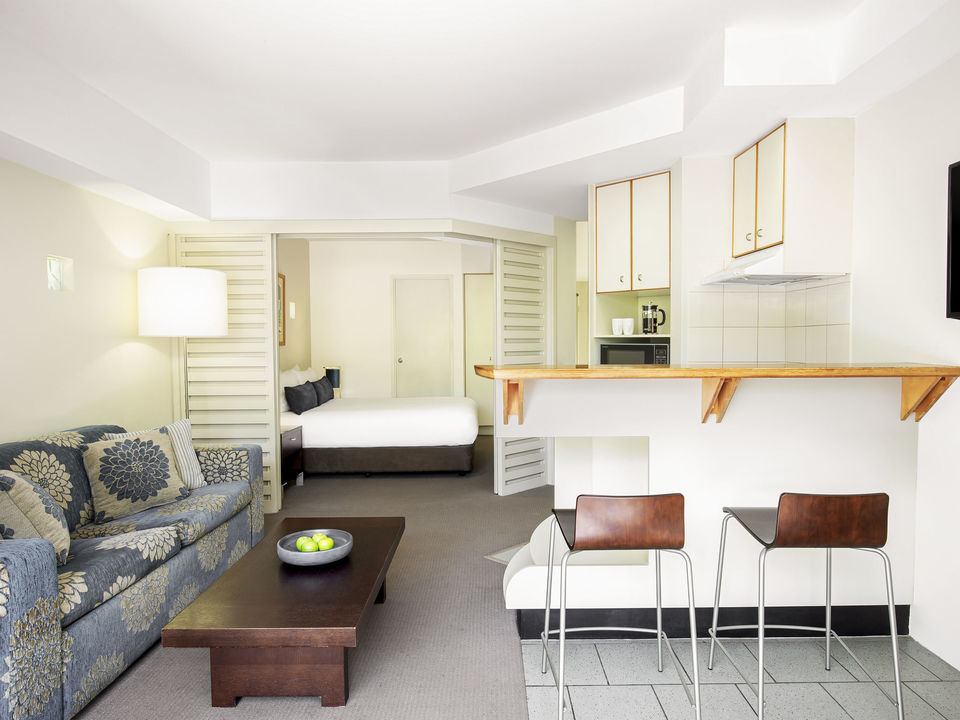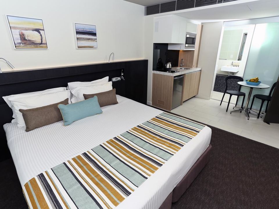 A by Adina Sydney biedt studio’s en appartementen met twee slaapkamers, allemaal met een geweldig uitzicht op de stad door de ramen die van de vloer tot het plafond lopen.