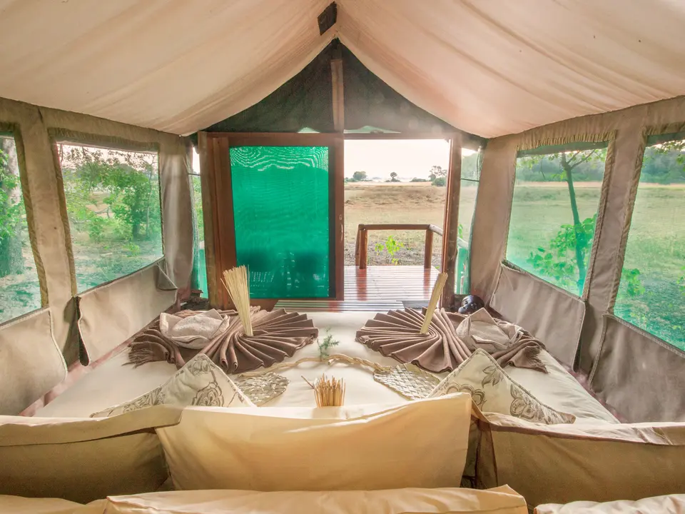 Alle wensbare faciliteiten voor een safarikamp zijn aanwezig bij Kwara Camp. Door de ligging zo diep verscholen in de delta zijn rust, authenticiteit en natuur hier de sleutelwoorden. Het centrale deel kijkt uit op de lagune, nestel je in een comfortabele stoel en geniet van het uitzicht, lekkere maaltijden en een prettige ambiance. Tussen de safaritochten door zoek je verkoeling in het zwembad. Met slechts 8 safaritenten is het een kleinschalig kamp en maak je makkelijk contact met overige gasten. Deel ervaringen en geef elkaar tips. Niet ondenkbaar dat je vrienden voor het leven wordt.