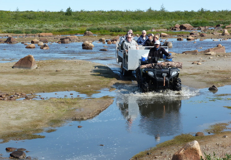 Vanuit de lodge waar we verblijven, maken we uitstapjes in kleine groepjes, vergezeld door een gewapende gids. Te voet, met de boot en in een soort aanhangwagen met stoeltjes achter een gemotoriseerd karretje gaan we erop uit. We rijden over de zompige permafrost, die bezaaid is met stug gras en paarse bloemetjes. Zeker de wandelingen zijn spannend. Zouden we ineens oog in oog staan met een ijsbeer? Onze gidsen Andy en Terry zijn bewapend met een geweer. Eén van hen loopt voorop en één van hen achteraan. Want de dieren zien er wel heel schattig uit, maar het zijn echte roofdieren.