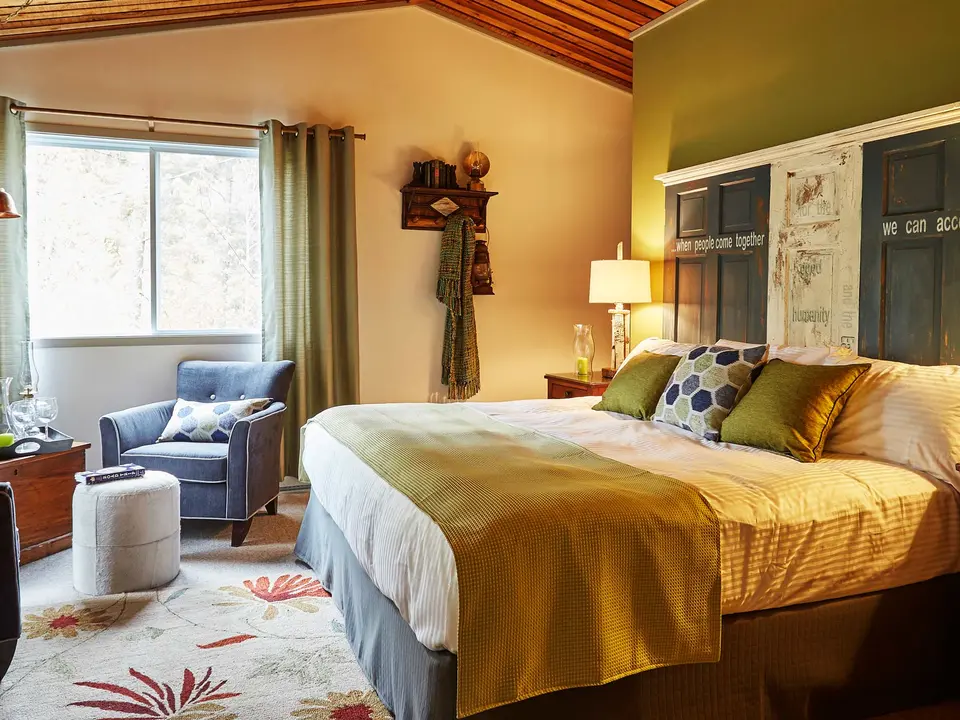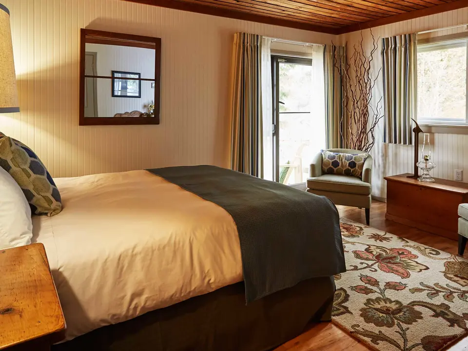 De 50 kamers zijn verdeeld over verschillende blokhutten welke allemaal langs de oever van het meer liggen. Elke hut heeft een centrale lounge waar je op comfortabele stoelen en banken rondom de open haard kunt zitten. Per blokhut zijn er tussen de 3 en 12 slaapkamers, ingericht met antieke meubels en voorzien van een badkamer. De kamers hebben geen televisie en er is geen Wifi aanwezig, maar met zo’n uitzicht mis je deze niet.