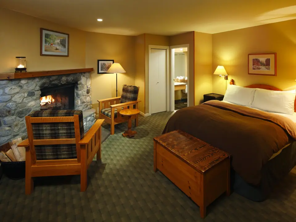 Er zijn verschillende kamertypes in dit hotel. Alle kamers zijn ondergebracht in houten cabins welke verdeelt staan over het terrein van de lodge en beschikken over een badkamer met douche, open haard en koffiezetapparaat. Geef bij boeking aan of je voorkeur uit gaat naar een kamer met één Kingsize bed (één groot tweepersoonsbed) of naar een kamer met twee Queensize bedden (twee twijfelaars). Zowel vier volwassenen als gezinnen met maximaal twee kinderen onder de 12 jaar kunnen in één kamer met twee Queensize bedden verblijven.