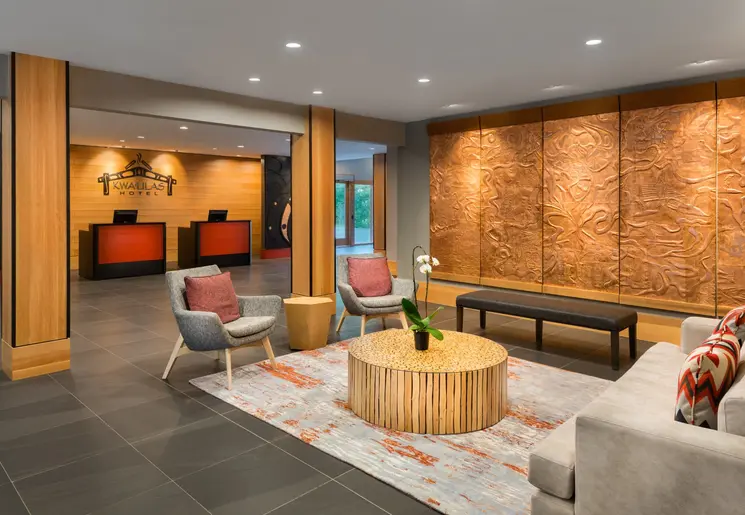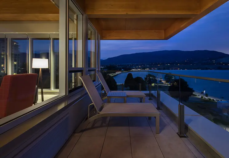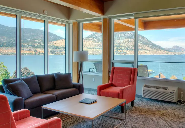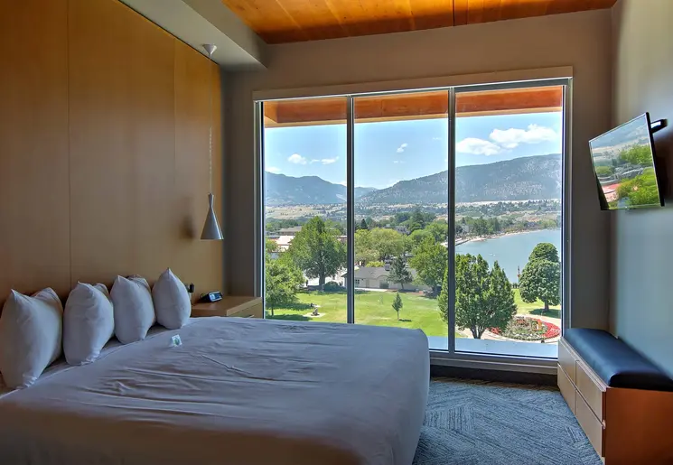 Groot hotel met veel faciliteiten, waaronder een binnenzwembad en diverse restaurants, op een geweldige locatie met uitzicht op het meer van Okanogan.