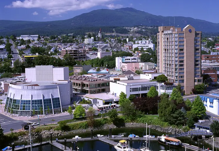 Je rijdt van de ferry-afvaart van Nanaimo naar je hotel in Nanaimo.