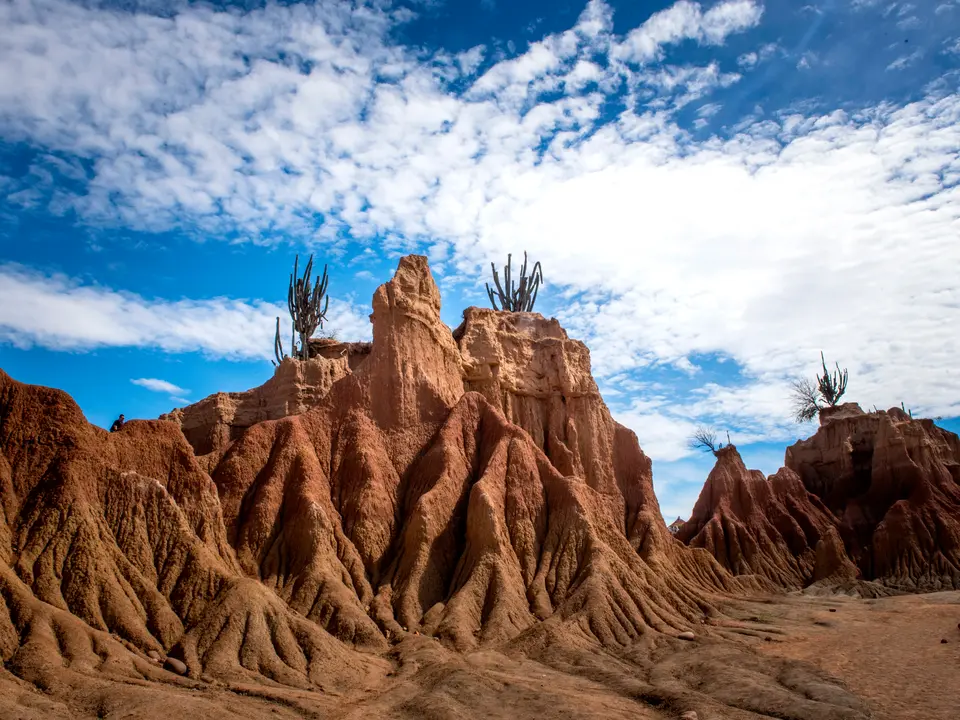 Het oranje deel van de Tatacoa woestijn wordt “Cuzco” genoemd en het grijze deel “Las Ventanas”. Je wandelt door beide gebieden. En je ziet niet alleen zand en rotsen, maar ook kanaaltjes en greppels. Door het water dat hier soms stroomt, groeien er tal van cactussen. Maar de meeste indruk laten de rotsen achter die door winderosie bizarre vormen hebben gekregen. Je blijft fotograferen! De wandeling duurt iets meer dan 2,5 uur. Je wordt begeleid door een lokale gids. Hij spreekt Engels, maar het niveau kan wat lager zijn dan van andere gidsen.
