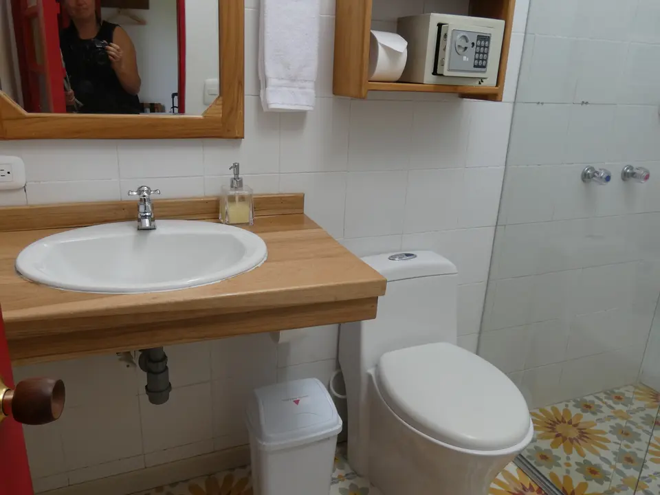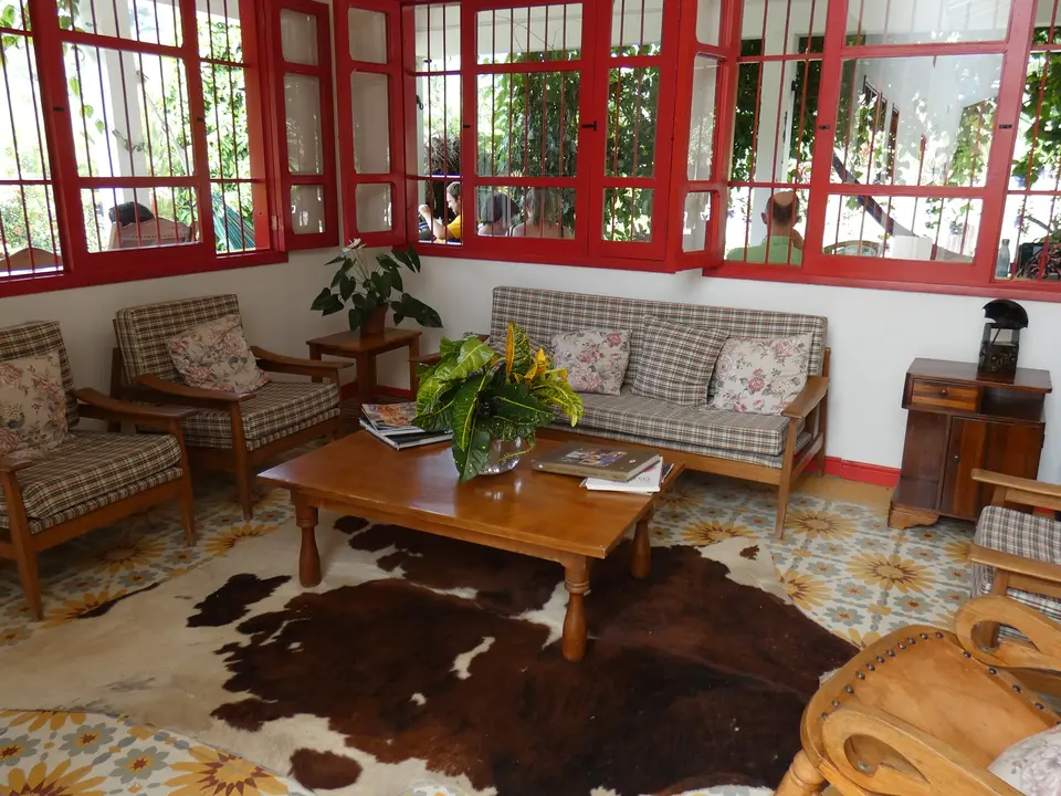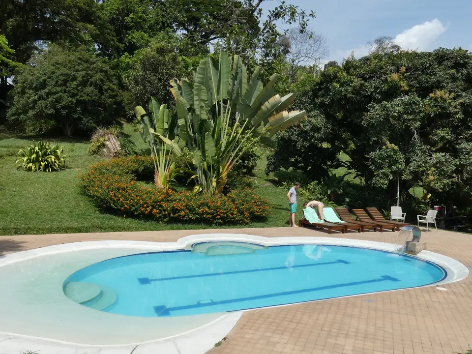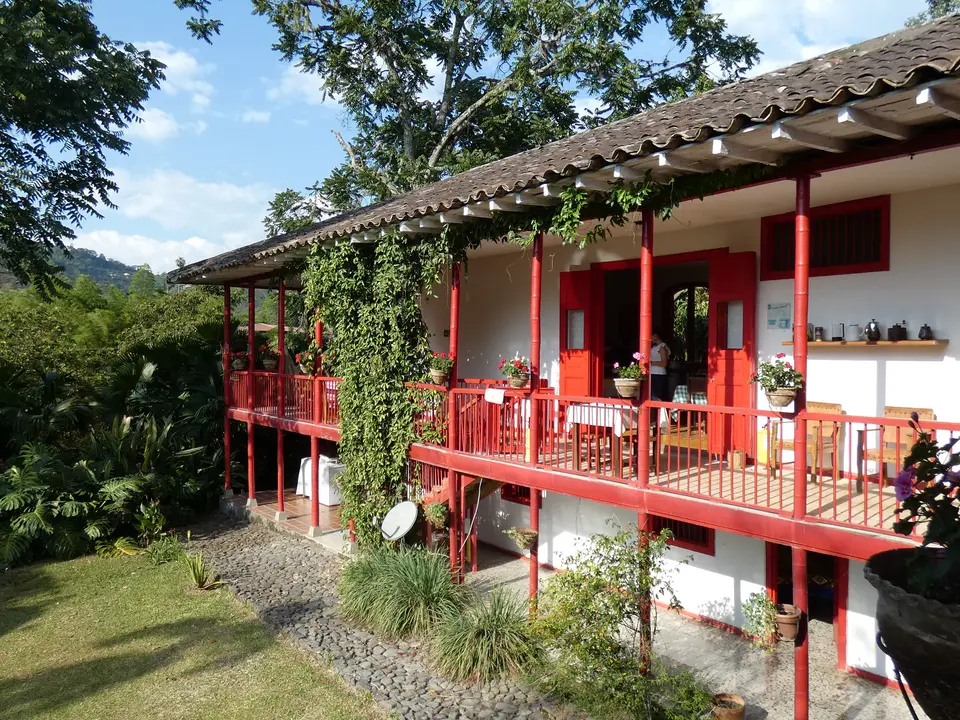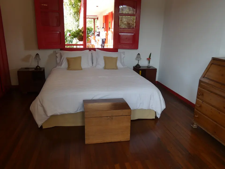Verdeeld over het enorme terrein dat eigendom van de Haciënda is, staan verschillende gebouwen. In drie gebouwen zijn kamers gevestigd. Er is onder anderen een hostal, hier worden geen kamers geboekt. Vlakbij de receptie is de koffielodge. Hier zijn elf kamers. Niet super-de-luxe, maar gewoon prima. Klein, maar functioneel. En let eens op de prachtige plavuizen op de vloer. Een groot voordeel is dat iedere kamer een klein balkonnetje met twee stoelen heeft. Elke kamer heeft een eigen badkamer met een douche met warm en koud water. Er is een kluisje en er staat een ventilator. Er zijn kamers met een tweepersoonsbed en kamers met twee aparte bedden. De helft van de kamers kijkt uit op de tuin en de andere helft op de plantage.