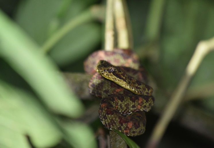 Eenmaal aangekomen bij de rivier gaan we op zoek naar kikkers, padden en… slangen! De kikkers zijn er in vele verschillende kleuren. De gids vertelt ons waar we de mannetjes en vrouwtjes aan kunnen herkennen. Hoe verder we de rivier doorlopen met onze regenlaarzen, hoe meer kans we hebben op het zien van een ‘viper’, dit is een adder. En daar hangt er één, mooi opgekruld in de boom!