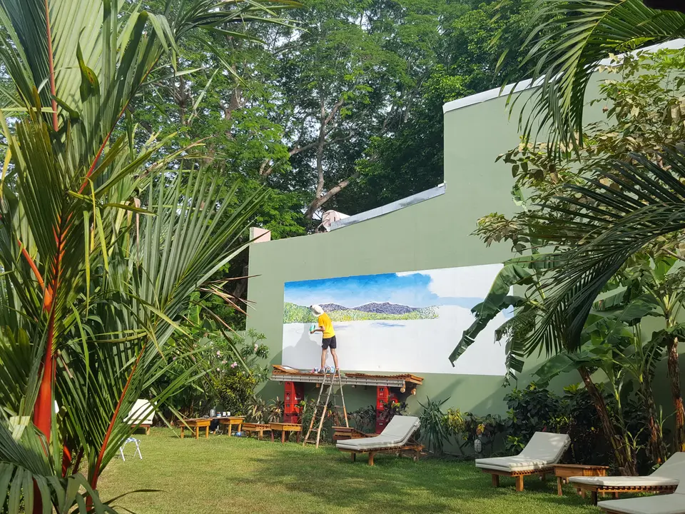 Op ca. 150 m van het strand van Sámara aan de hoofdweg die door het dorp loopt. Je kunt aan de overkant van het hotel je auto parkeren.