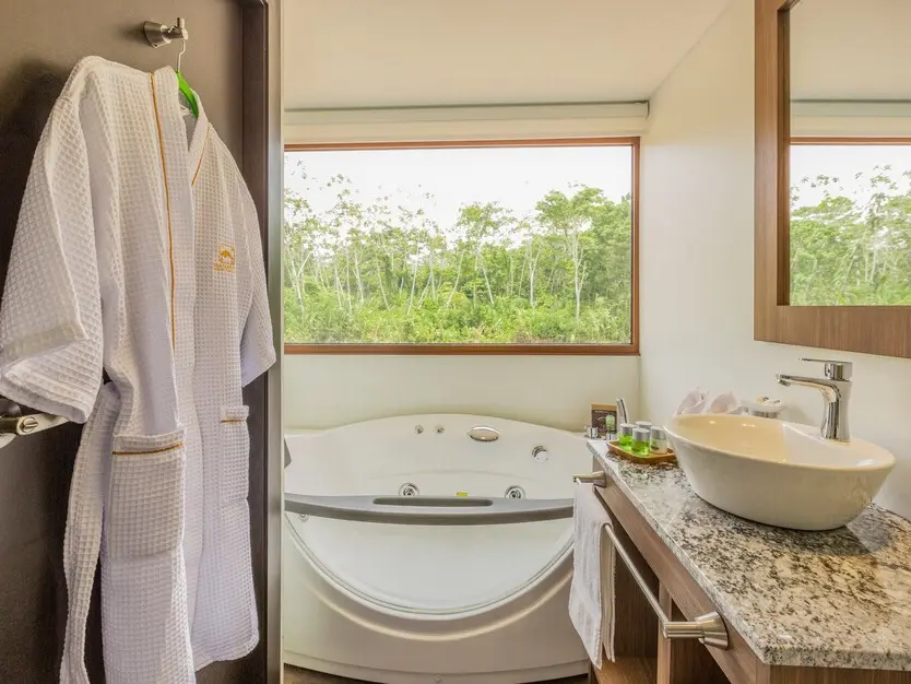 Er zijn standaardsuites en deluxe suites. De standaardsuites zijn 3,8 bij 5 meter groot. De deluxe suites zijn 3,8 bij 6 meter groot. In beide types heb je de keuze uit een tweepersoonsbed of twee losse bedden. Er zijn hutten met een tussendeur. Het maakt niet uit of je voor een standaard- of een deluxe suite kiest qua uitzicht: er zijn alleen maar buitenhutten en alle hebben een groot panorama raam, dat van de vloer tot het plafond loopt. Beide beschikken ook over airconditioning en bij beide hutten heb je een balkon met twee stoeltjes. In de badkamer van de standaardsuite is een toilet, een wastafel en een douche. De deluxe suite heeft een badkuip met whirlpool functie. Warm water is 24 uur per dag beschikbaar. Er ligt een haardroger.