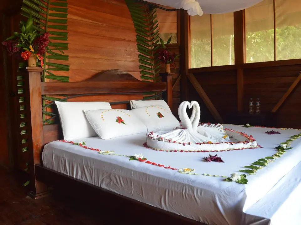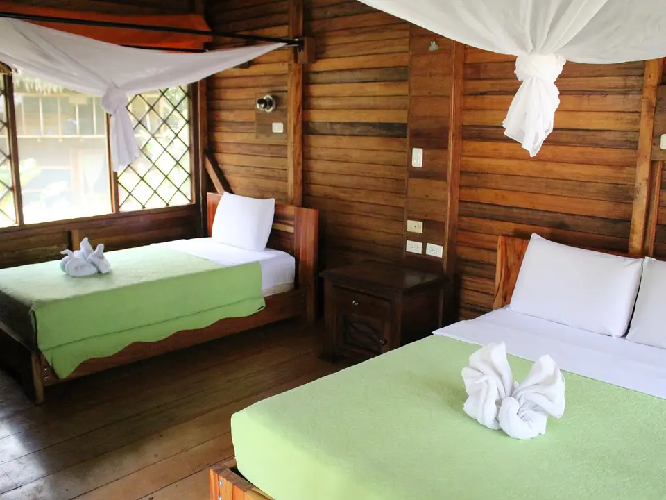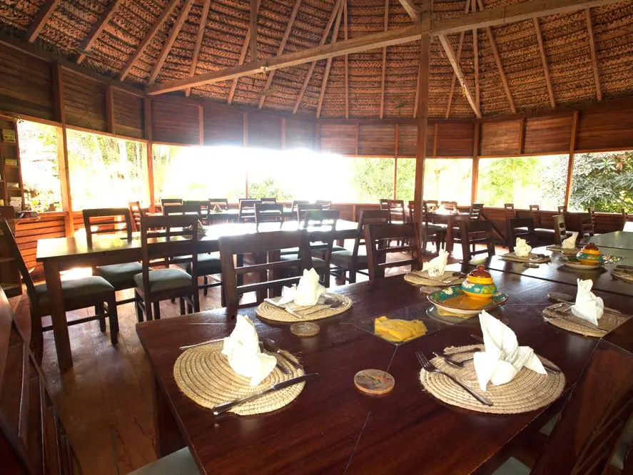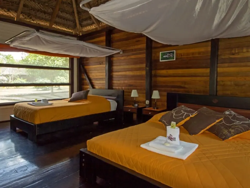 Je verblijft in een luxe hut. In totaal zijn er dertien. Alle hutten zijn in lokale stijl gebouwd. Materialen uit de omgeving zijn gebruikt, net als de locals voor hun eigen huizen gebruiken. Voor de ramen zit geen glas, maar er is muskietengaas voor gespannen en daken zijn van bladeren gemaakt. Iedere hut heeft een ventilator en stromend water. Pure luxe in sterren uitgedrukt moet je hier niet verwachten, maar er zijn mooie kamers met stijlvolle houten meubels, een veranda, balkon of terras. Iedere kamer heeft een eigen badkamer met een douche met warm water. Boven de bedden hangt een klamboe. Er is elektriciteit in de kamers.