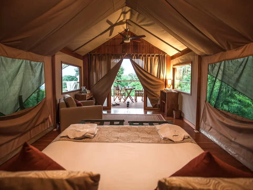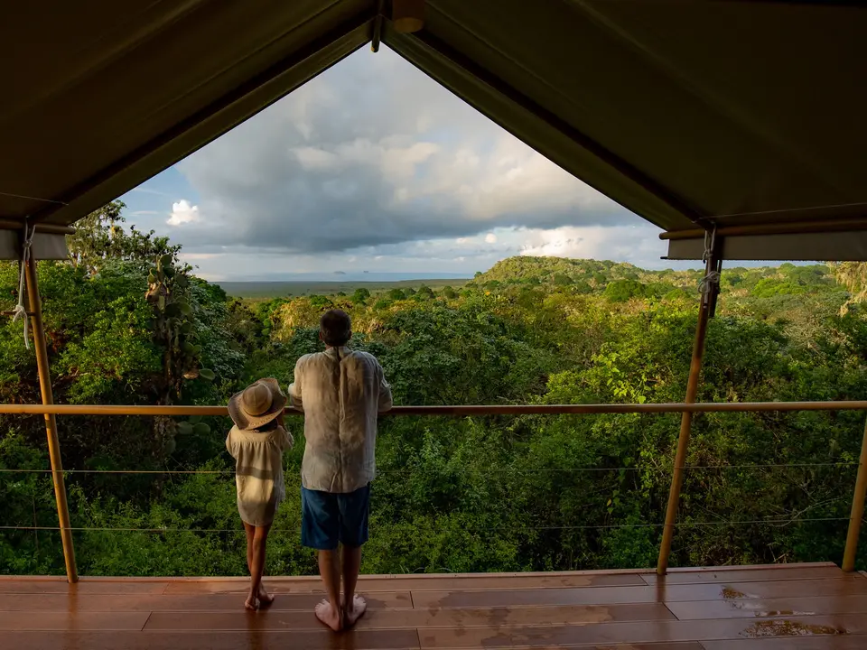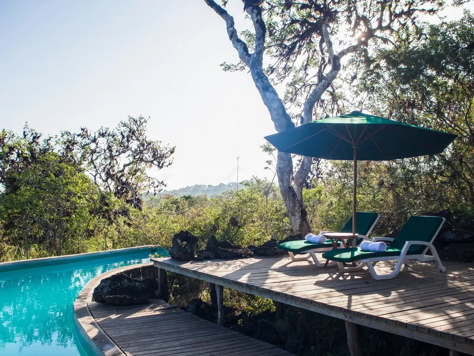 Het uitzicht vanaf de terrassen over de natuur is schitterend. Alleen dit is al een reden om voor het Galapagos Safari Camp te kiezen. Hier bevind je je echt midden in de natuur. Je slaapt in luxe safaritenten. Mooi ingericht en met een douche. Duik na een safari in het zwembad bij het tentenkamp. Ecoluxe noemt het hotel zelf hun concept.