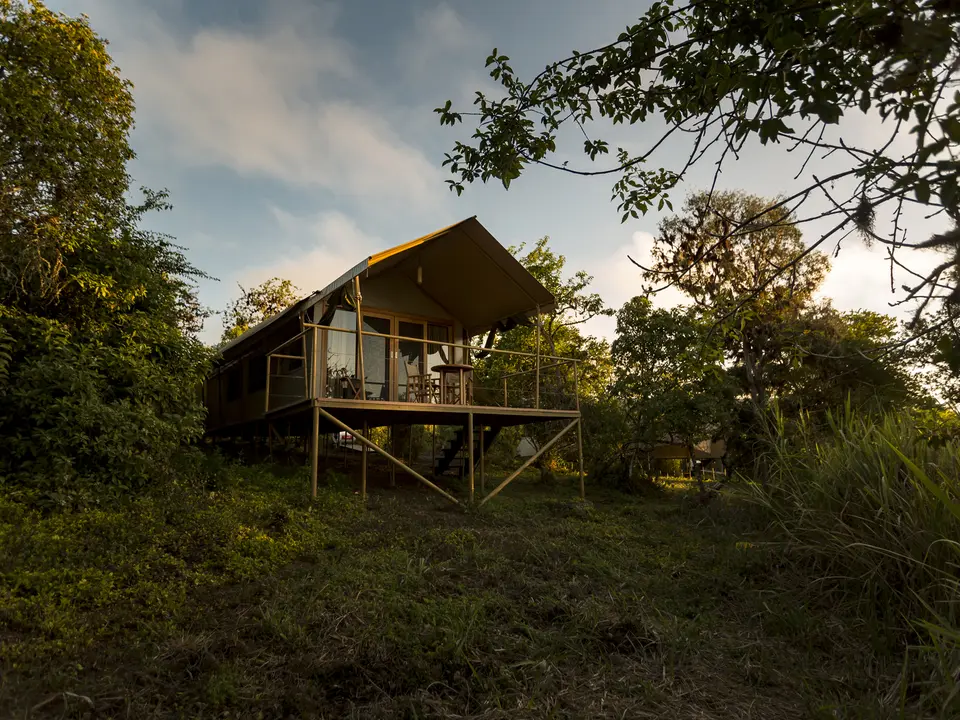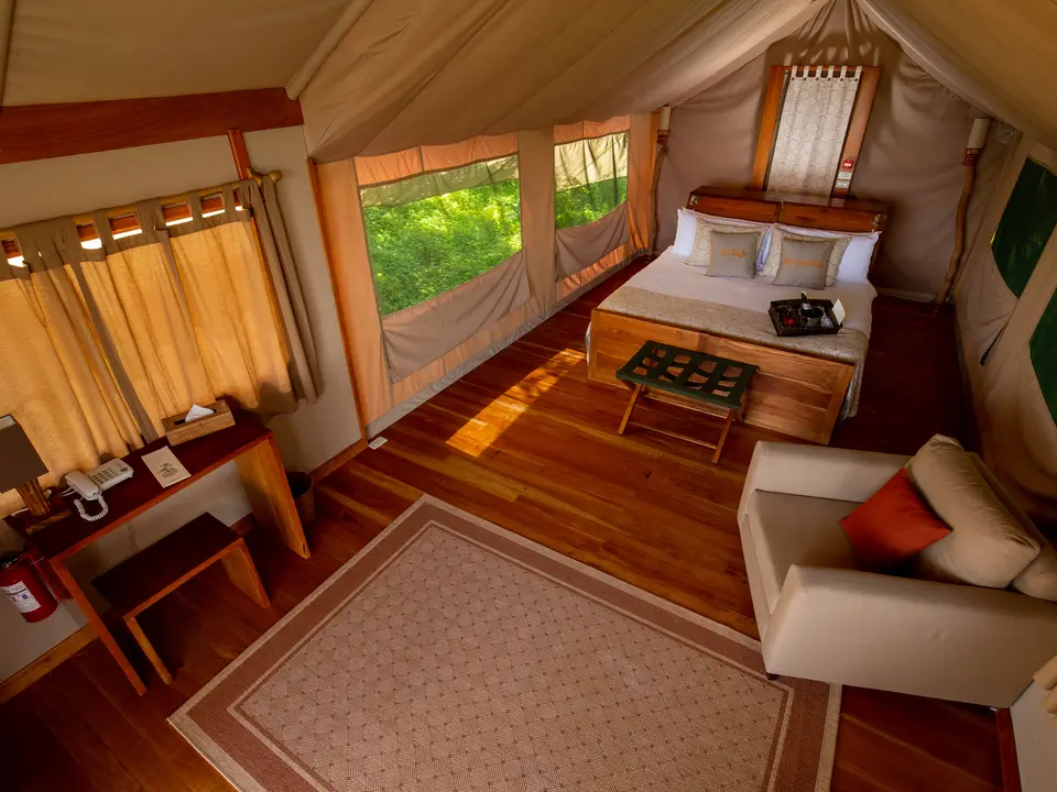 Je komt binnen in de lounge met grote ramen en veel houten kunstvoorwerpen; schitterend. Maar de naam van deze accommodatie is Safari Camp en het is ook echt een tentenkamp, maar wel met luxe canvas safaritenten. De negen tenten staan ver uit elkaar en een stukje vanaf het hoofdgebouw; je hebt dus veel privacy. Voor iedere tent is een ruim houten balkon met een hangmat. Je hoeft ook zeker niet in de tent te kruipen. Het is zeer ruim. In de tenten sta je gewoon rechtop. De inrichting is stijlvol. Er ligt een houten vloer in. Ook de meubels zijn van hout. Een bed, een bureau, het badkamermeubel waar de wasbak op staat, een tafeltje. Een comfortabele fauteuil staat eveneens in de kamer. Op het balkon staan twee stoelen en een tafeltje. En er zijn zelfs stopcontacten zodat je je telefoon en camera op kunt laden. In de badkamer is een douche met warm en koud water. Het water wordt verwarmd met zonnepanelen. Er zijn tenten voor twee en tenten voor drie personen.