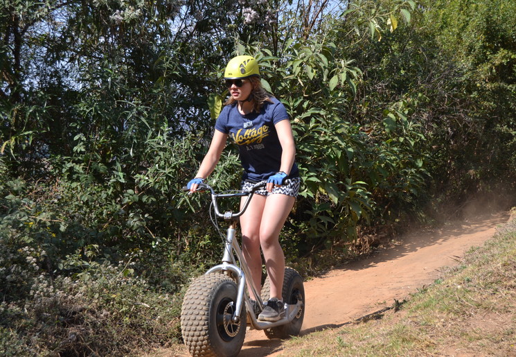 Tijd voor een sportief uitje! Freewheel van een berg af op een monsterstep! De reuzensteps zijn niet-gemotoriseerd en dus milieuvriendelijk. Deze in Zwitserland ontworpen steps worden in de Alpen gebruikt tijdens het zomerseizoen op de skipistes. Als je kunt fietsen, kun je ook steppen. Jullie verzamelen bij Sandra se Winkel, een typisch Zuid-Afrikaanse antiekwinkel. Hier staat een 4WD klaar om jullie naar de top te brengen. Na een korte uitleg en foto’s van het uitzicht zetten jullie je helm op en is het tijd om op pad te gaan. Kinderen onder de 9 jaar gaan samen met hun ouder op de step. De gids rijdt voorop. In het begin rijden jullie over smalle zandpaadjes, met links en rechts bomen. Hier en daar moeten jullie een rivier oversteken. Gelukkig liggen er houten bruggen overheen. Onderweg wordt regelmatig gestopt om van het uitzicht te genieten en foto’s te maken. Jullie staan steeds steviger op de step, dus de wat steilere afdalingen zijn voor het laatst bewaard. Met een beetje geluk spotten jullie onderweg een adelaar of een gier. Kinderen van 4-9 jaar kunnen mee als passagier bij één van hun ouders. Kinderen vanaf 10 jaar kunnen zelf steppen.
