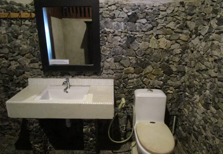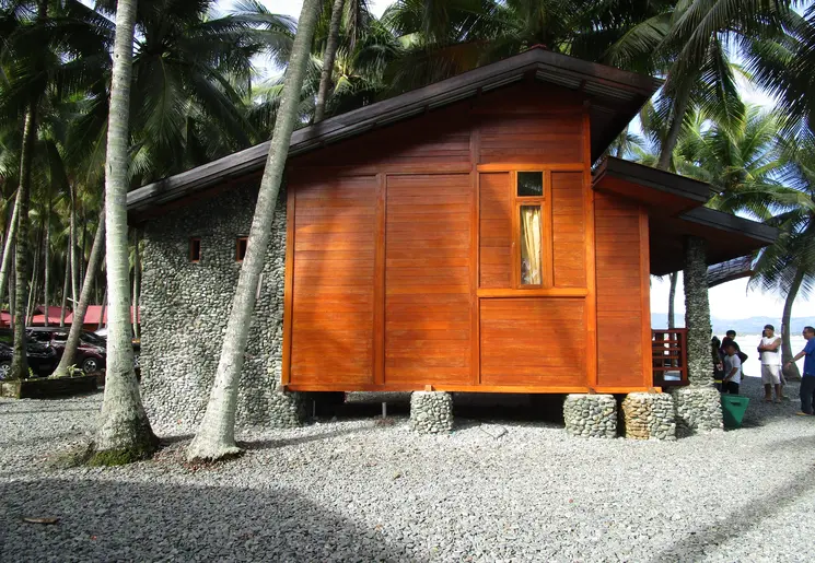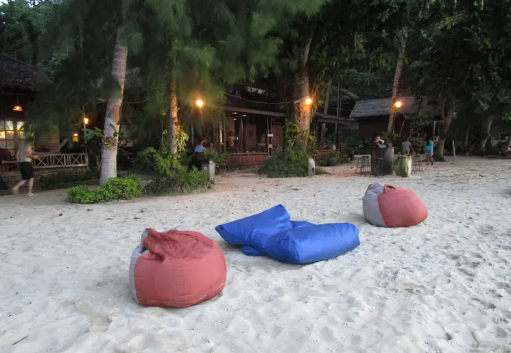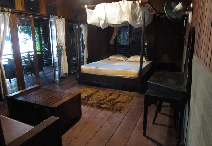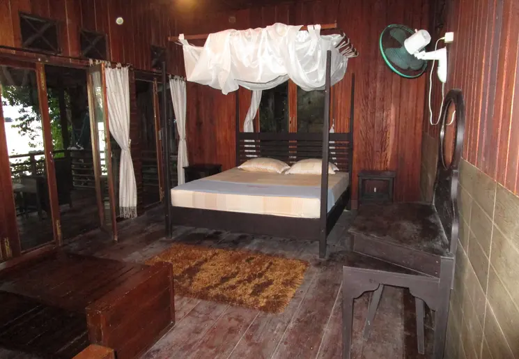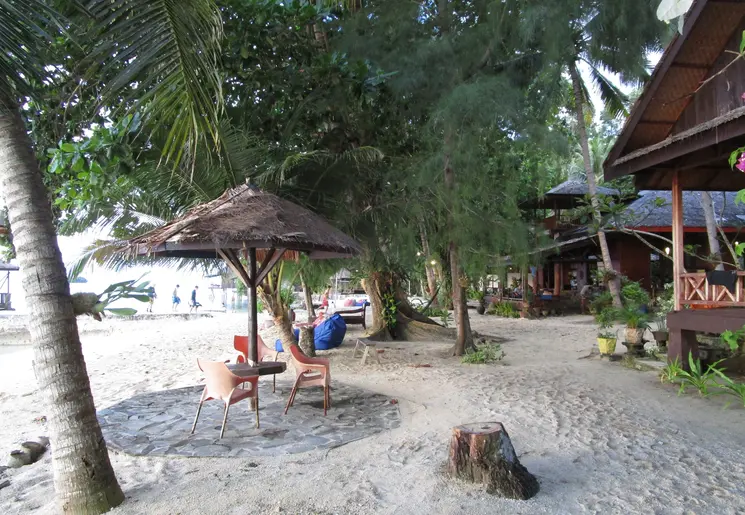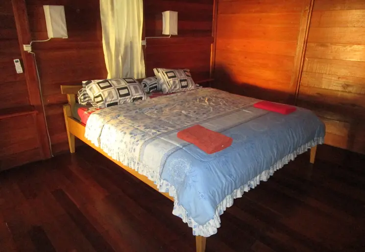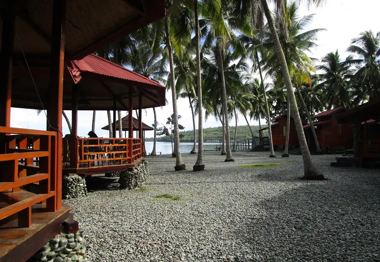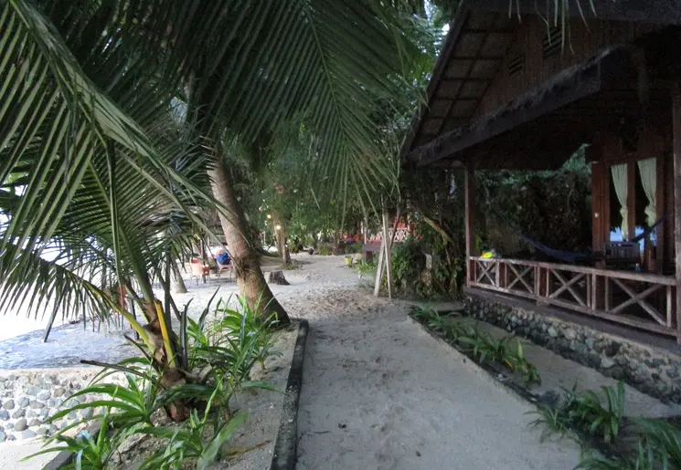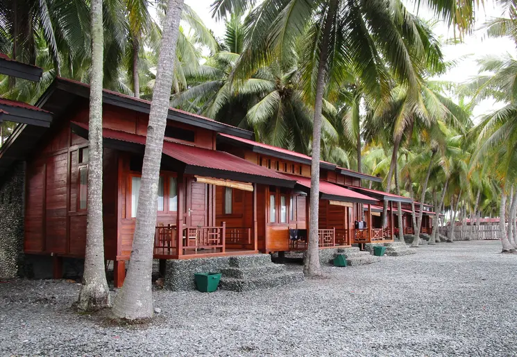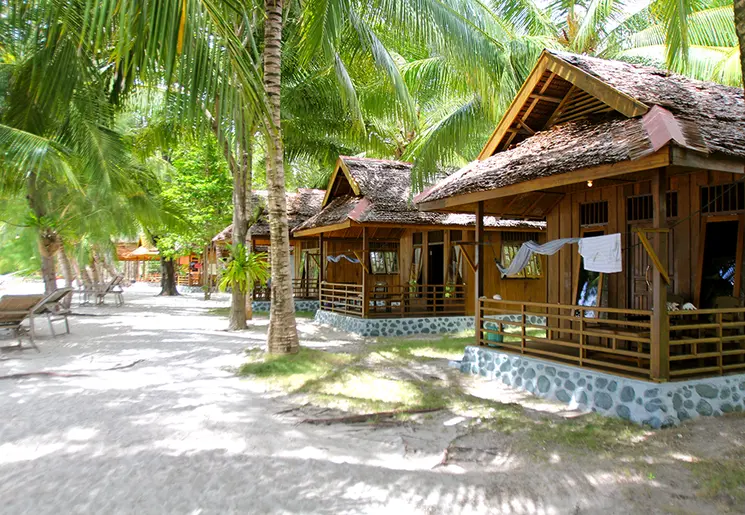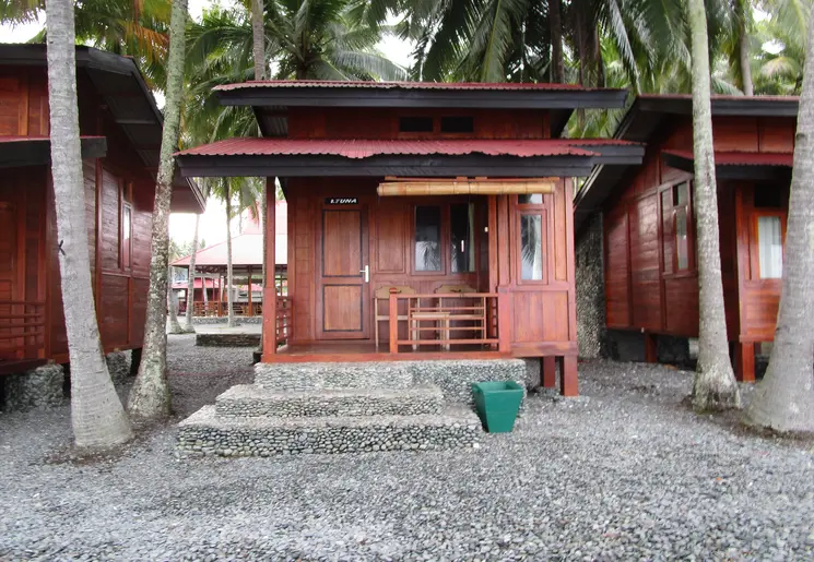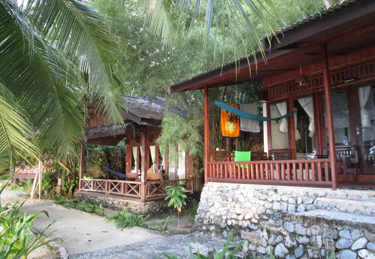 Eenvoudige houten bungalows aan zee gelegen. Dit is op dit moment het beste hotel ter plekke.