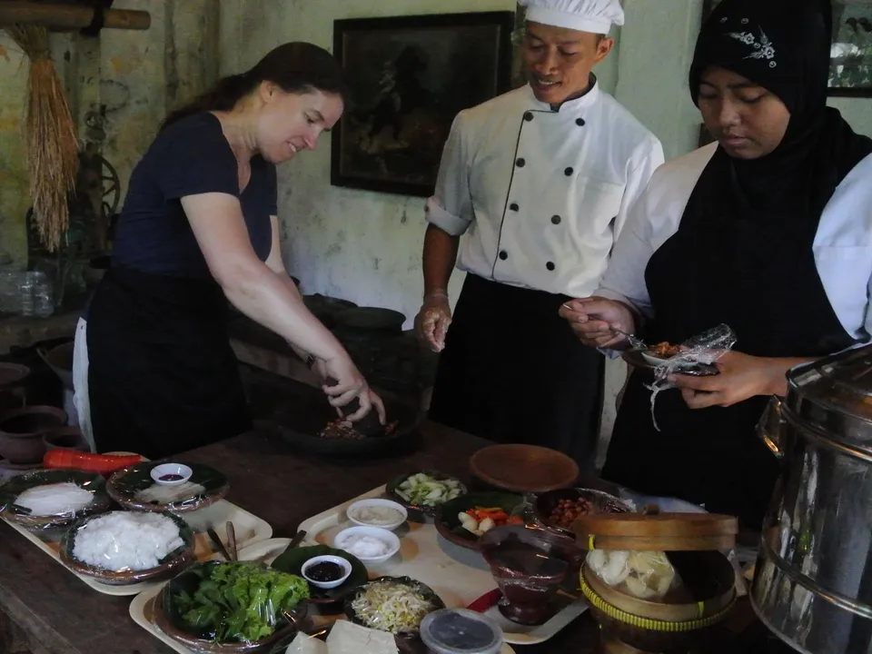 Je leert meer over de Javaanse keuken. Per becak samen met een personeelslid van het Tugu Hotel ga je naar de markt. Je koopt de ingrediënten en krijgt uitleg over allerlei kleurrijke groenten en vruchten die hier te koop aangeboden worden. Zijn alle ingrediënten ingekocht? Dan is het tijd om aan de slag te gaan. Onder begeleiding van een kok bereid je 3 gerechten. De ingrediënten samenvoegen, roeren, bakken, snijden, decoreren; je bent druk bezig. Daarna is het natuurlijk tijd om je eigen bereide gerechten op te eten, selamat makan! De kookcursus is hier wat minder professioneel dan op andere plekken, maar het heeft charme.