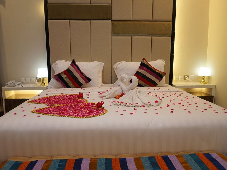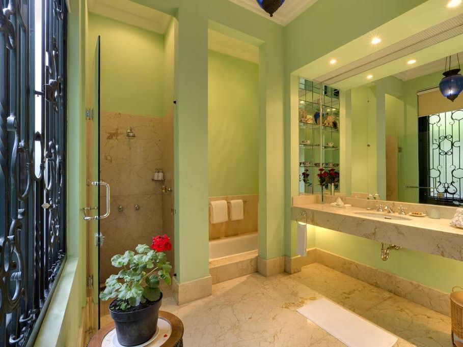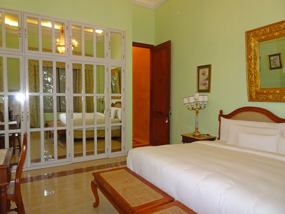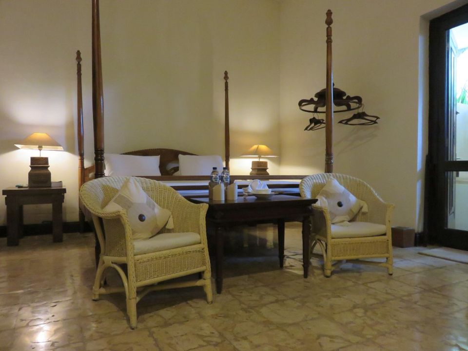 Er zijn 2 twin rooms (2 aparte bedden) en 2 double rooms (1 tweepersoons bed). De twin rooms hebben een slaapkamer van normale afmeting, prachtig houtsnijwerk achter de bedden. De double rooms zijn vrij klein, bed past er net aan in. Maar ze hebben wel een aparte (kleine) livingroom (zitgedeelte).