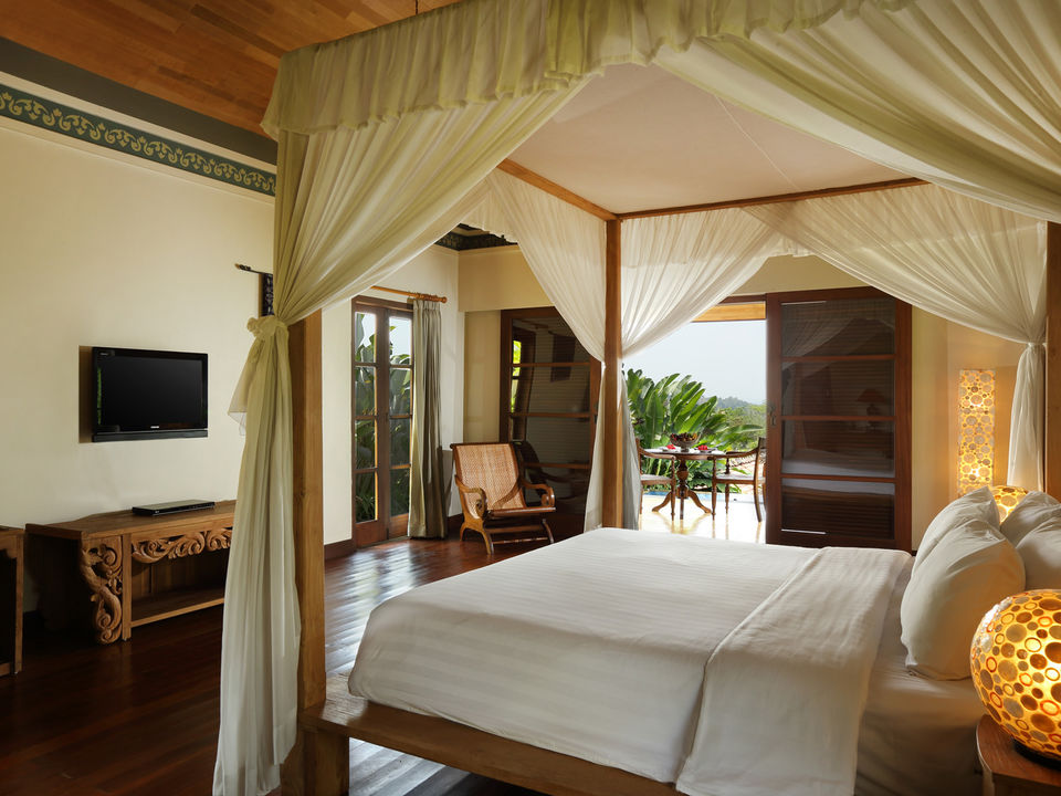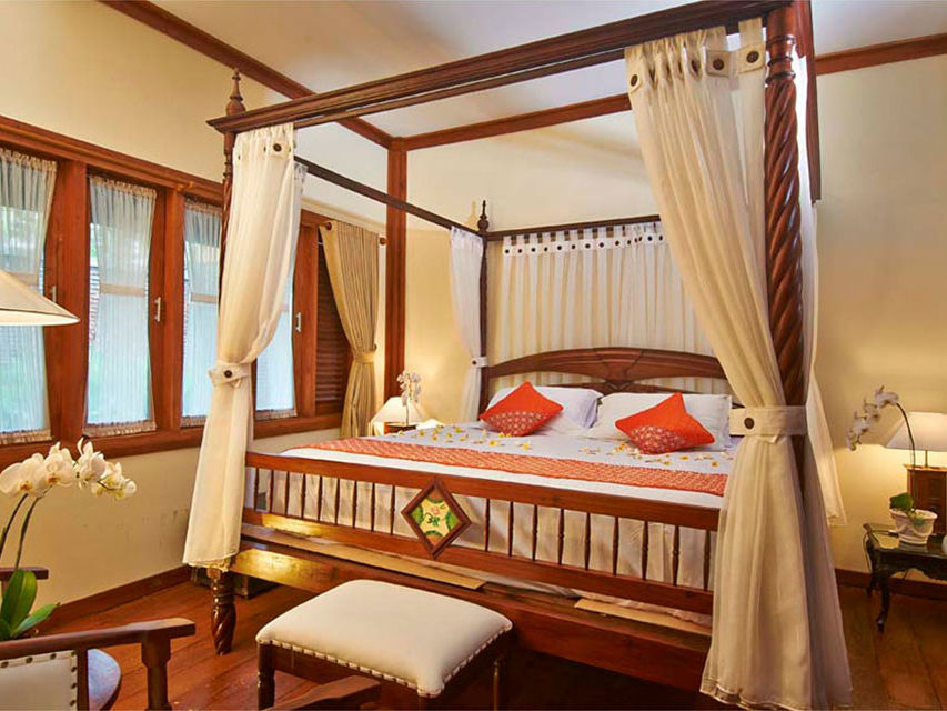 5 Royal Queen Villa’s: deze zijn in het Javaans huis-gedeelte (4) en in het Pendopo-gedeelte (1). Deze kamers zijn enorm groot, zelfs zo groot dat je je eerst afvraagt wat de reden is van deze omvang (tussen de 70 en 80 vierkante meter). Wel, even een blik omhoog en het is duidelijk: de kamer is zo groot als het historische plafond. Wat een schoonheid! Het zal duidelijk zijn dat de afmetingen verschillen, de een is wat groter, de ander wat kleiner, de een heeft een ligbad, de andere een (buiten)douche. Buiten, aan de gevelzijde, is een zitje. De villa in het Pendopo-gedeelte is niet geschikt voor kleine kinderen (aan het ravijn).