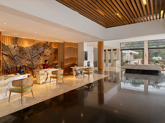 Je wordt ontvangen in een prachtig historisch Javaans huis, enorm groot. Een Javaans huis heet een joglo. Hier zijn de receptie en de lobby van het hotel. Het huis is een authentiek huis, afkomstig van rijke Javanen. Dit is te zien aan het fraaie plafond en de bewerkte en beschilderde houten muren. Ook staan er vele historische voorwerpen, onder andere een kostbare krissenverzameling. Ook sieren antieke wayangpoppen deze rijke omgeving.