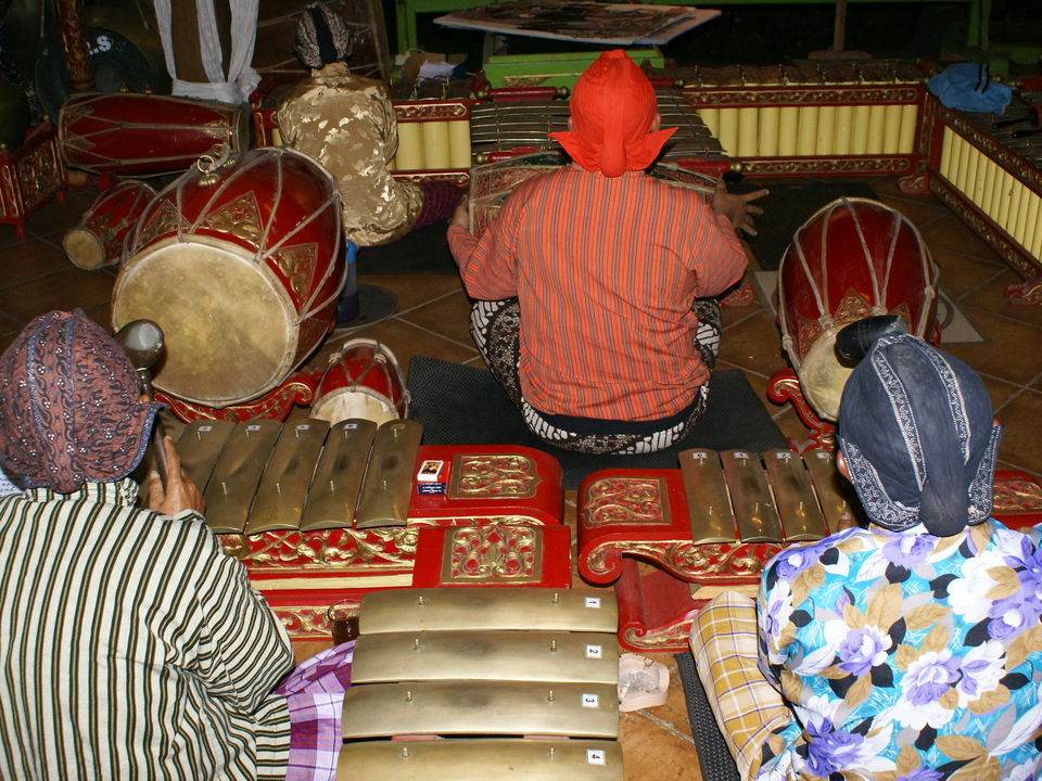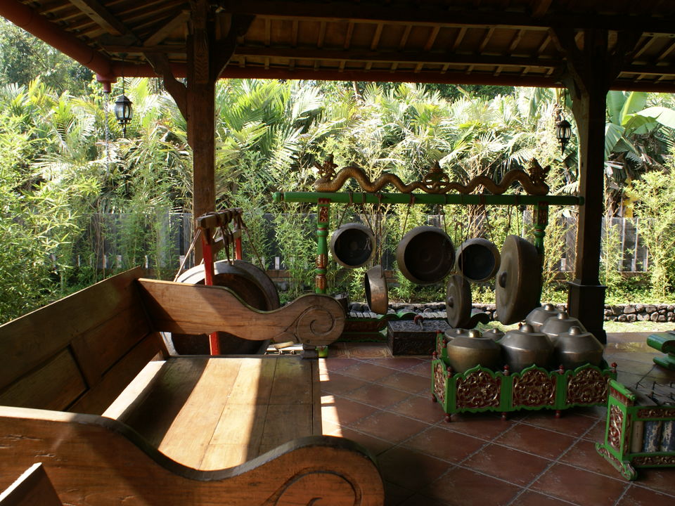De pendopo in Joglo Plawang is enorm groot, met zij-pendopo’s. En, heel bijzonder, er staat een antiek gamelan-instrumentarium opgesteld, waar dorpelingen ’s avonds oefenen en waar je tijdens je diner van kunt meegenieten. De opkomst is wisselend: soms zijn ze allemaal present, soms zijn er maar een paar muzikanten.
