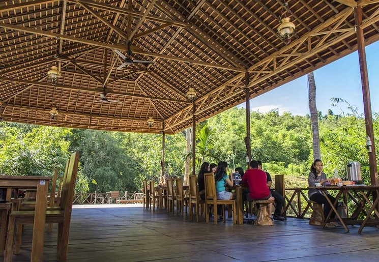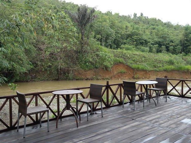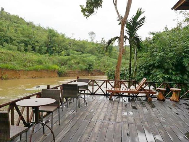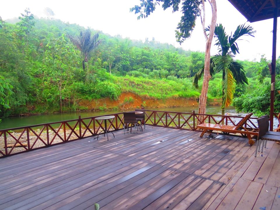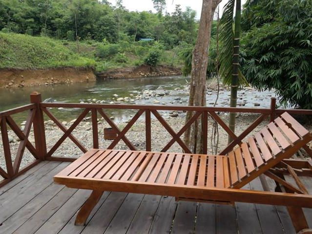 Eenvoudig hotel met houten huisjes en minimale inrichting, maar op een prachtige locatie met uitzicht over de rivier.