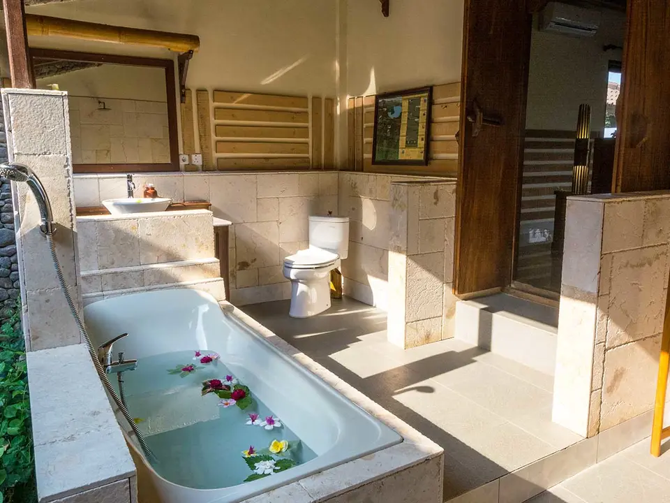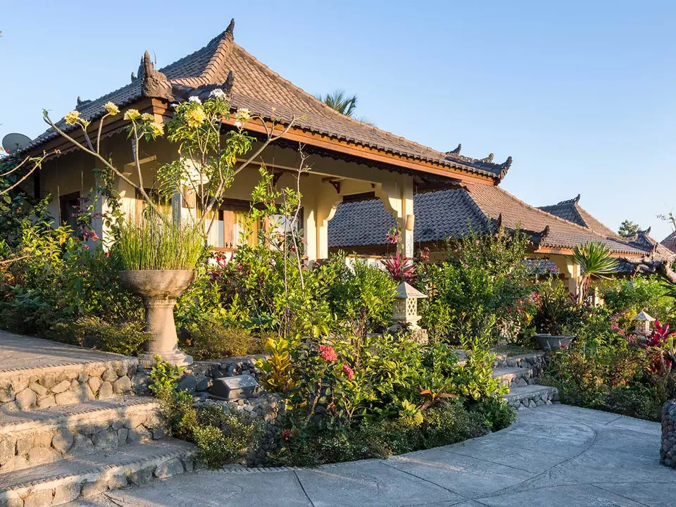 Fraai boutique hotel, gelegen aan de rand van het Rinjani National Park, met prachtige uitzichten op Mount Rinjani. Om je heen bomen, groen en natuur. De tuin is gevuld met kleurrijke bloemen.
