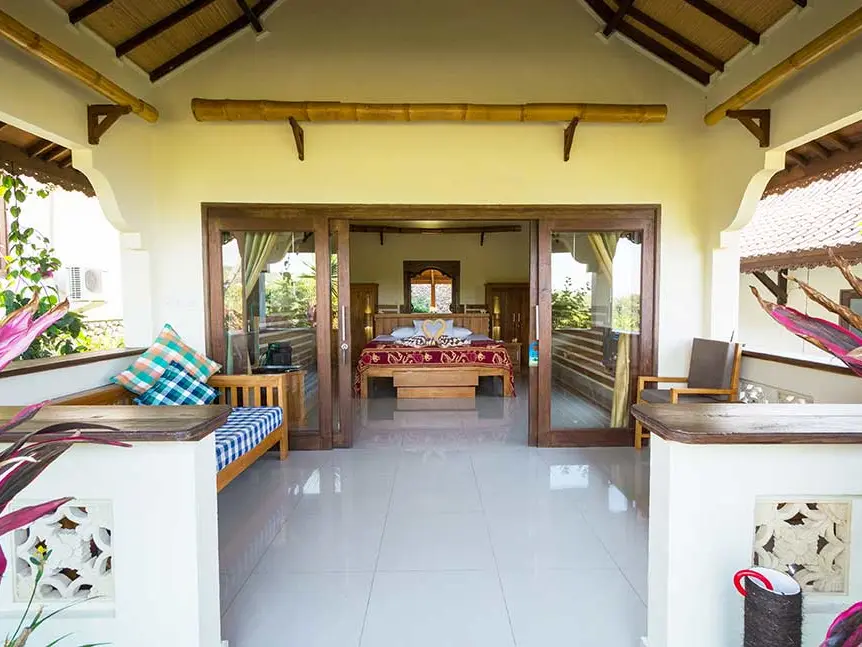 Deze lodge beschikt over 5 mooie kamers (lodge room genoemd) met een eigen terras, waarvandaan je uitzicht hebt op Mount Rinjani. Alle kamers hebben een tweepersoonsbed met onderschuifbed, dat als derde bed kan dienen. Verder is er airconditioning, ventilator, koelkastje, koffie- en theezetfaciliteiten en televisie met dvd-speler. De open badkamers zijn voorzien van een bad, douche met warm water uit vulkanische bronnen en een toilet. Op het terras staat een ligbed om even tot rust te komen en er staat een tafel met stoelen.