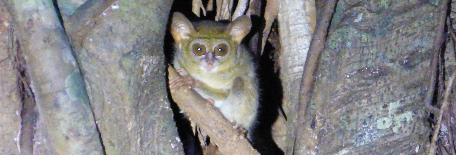 De tarsius is het kleinste primaat ter wereld, een soort spookdiertje. Ze zitten in spleten van holle bomen. Bij de eerste boom keek ik vol spanning. Stil zijn en afwachten….. Maar geen geluk hier. De tarsius was blijkbaar verhuisd. Na een stukje door het bos ploeteren kwam ik met mijn gids bij een volgende boom. En na even wachten was het zover: een piepklein diertje met grote ogen verscheen in een spleet van de boom. Het lijkt wel een gremlin!