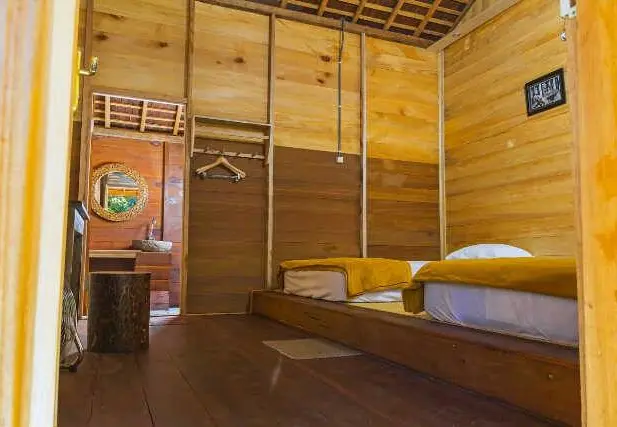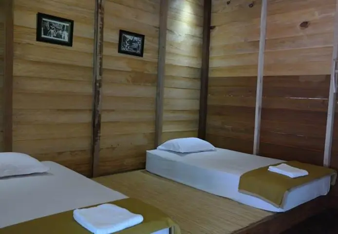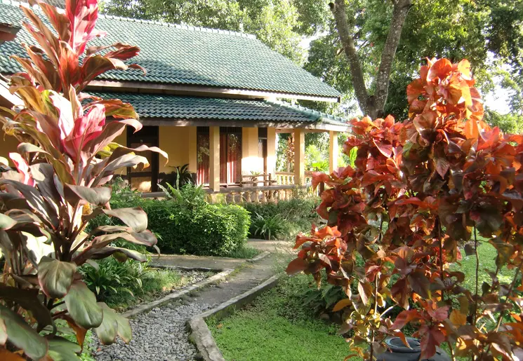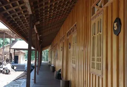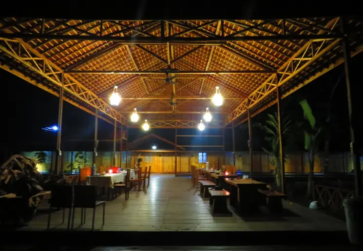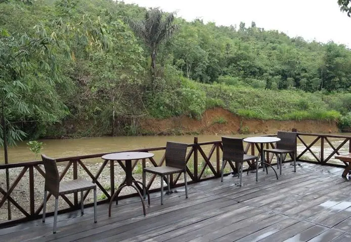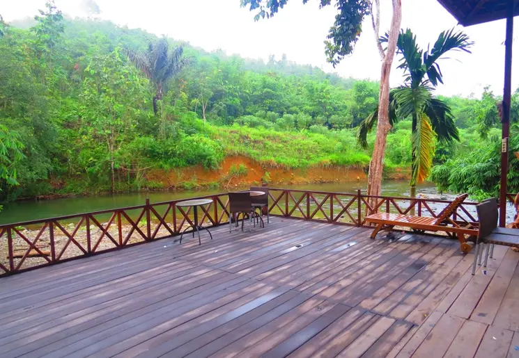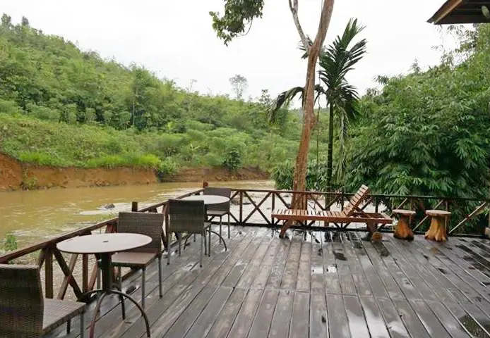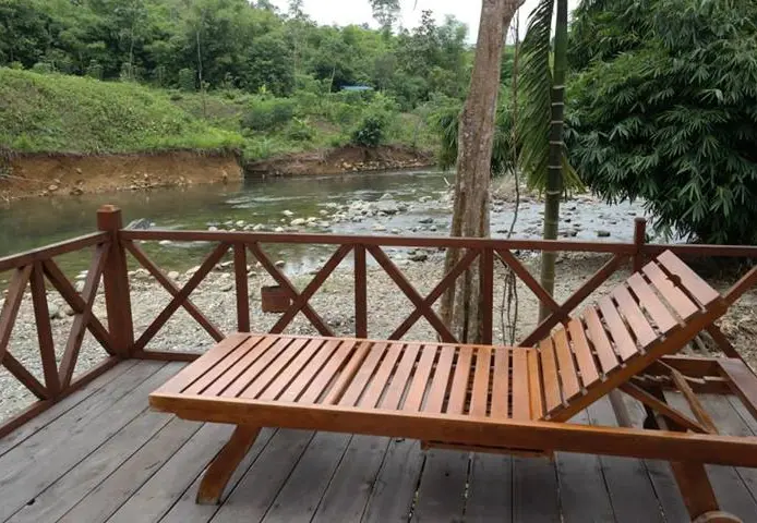 Eenvoudig hotel met houten huisjes en minimale inrichting, maar op een prachtige locatie met uitzicht over de rivier.