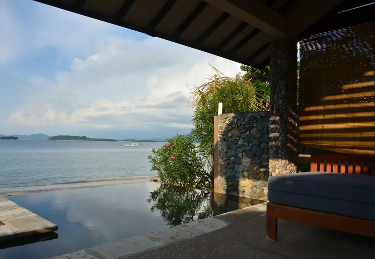 Een plaatje: groene bergen rijzen op, palmbomen sieren de weelderige tuin van het resort, maar voor de deur ligt een lang wit zandstrand en het blauwe water van de Indische Oceaan.