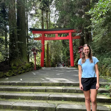 Collega Emma bij de Hirou Shrine in Kumano Kodo, Japan