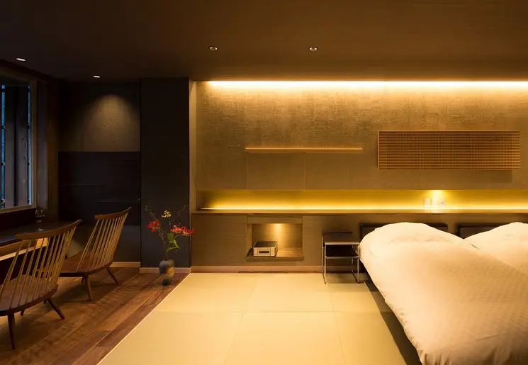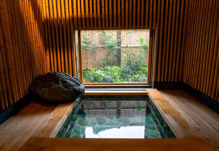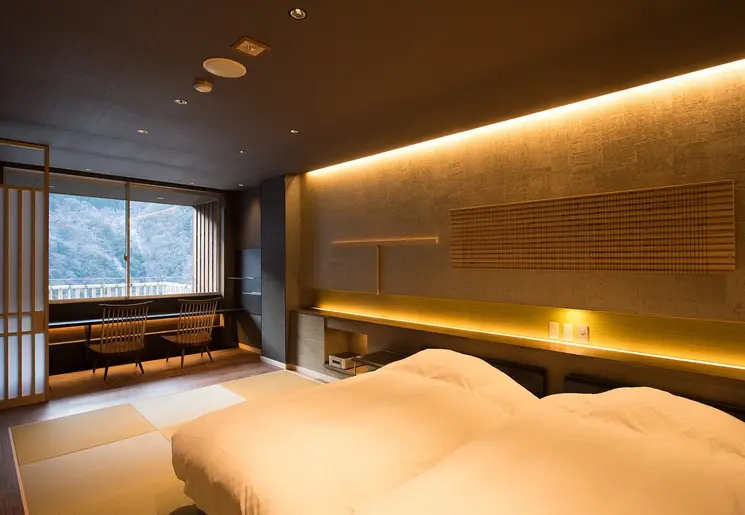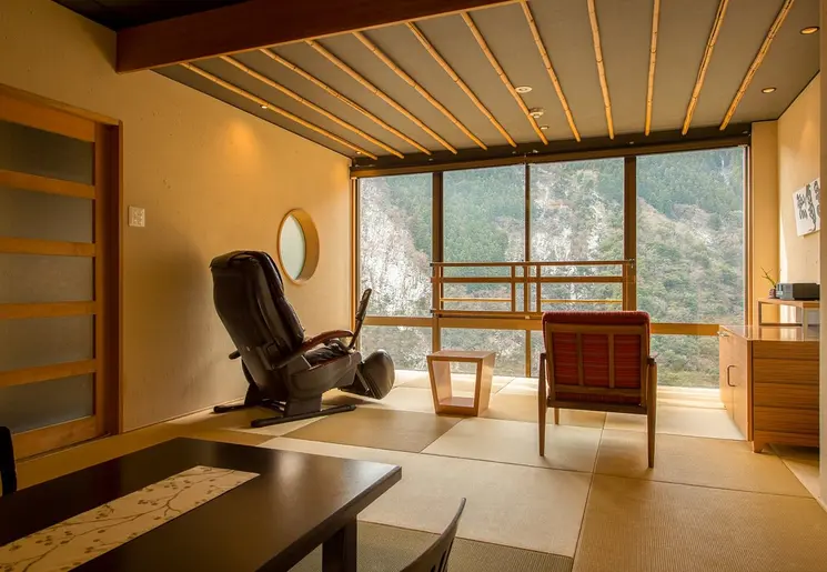 Aantrekkelijk hotel met houten gevel; een bijzondere architectuur. Het hotel heeft moderne voorzieningen, maar toch is het een traditionele Japanse accommodatie. Denk daarbij aan warmwaterbronnen voor een onsen-ervaring.