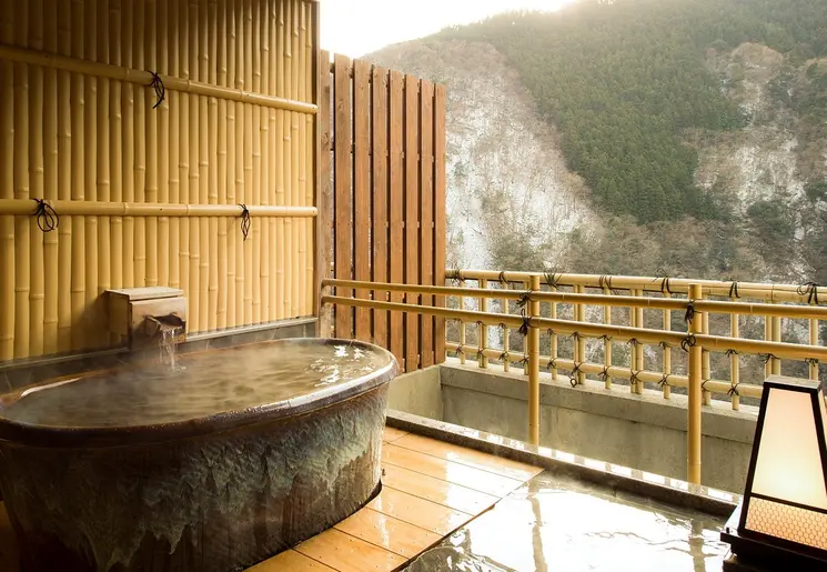 Helemaal passend bij de omgeving, slaap je vanavond in een ryokan met warmwaterbronnen. Het mooiste bad bereik je met een kabelbaan van 100 meter vanaf het hotel.