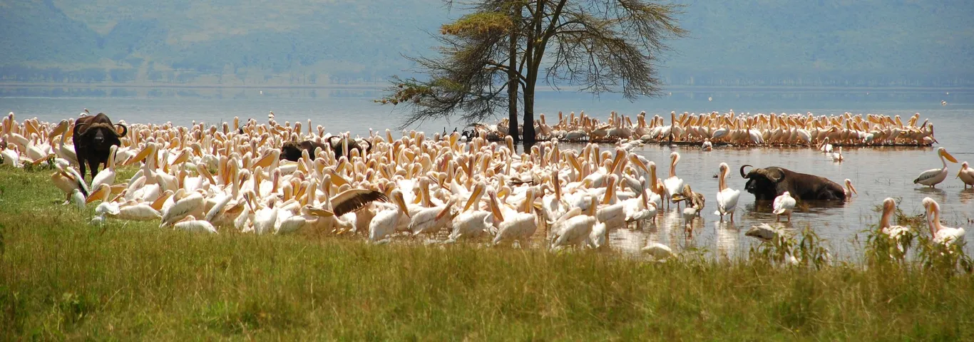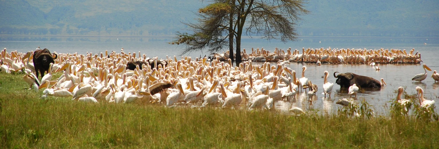 Lake Nakuru ligt tussen 2 hoge bergketens in, die een spectaculaire achtergrond vormen voor het meer. Het zoetwatermeer is ontstaan door de Great Rift: een reusachtige scheur in de aardkorst. Ooit woonde een derde van alle flamingo’s ter wereld in dit park, helaas nu veel minder en afhankelijk van het seizoen! Na flinke regenval stijgt het water en trekken de flamingo’s naar meren zoals Lake Bogoria of Lake Naivasha. In het Lake Nakuru National Park leven ruim 400 verschillende vogelsoorten, waaronder pelikanen. Je ziet ze vooral bij de Makalia watervallen in het noorden van het park en vanaf het uitkijkpunt Pelican Point.