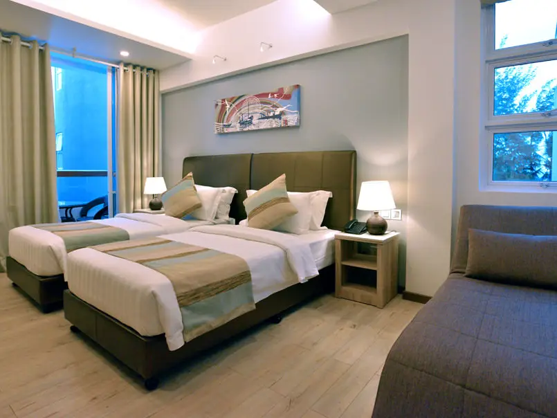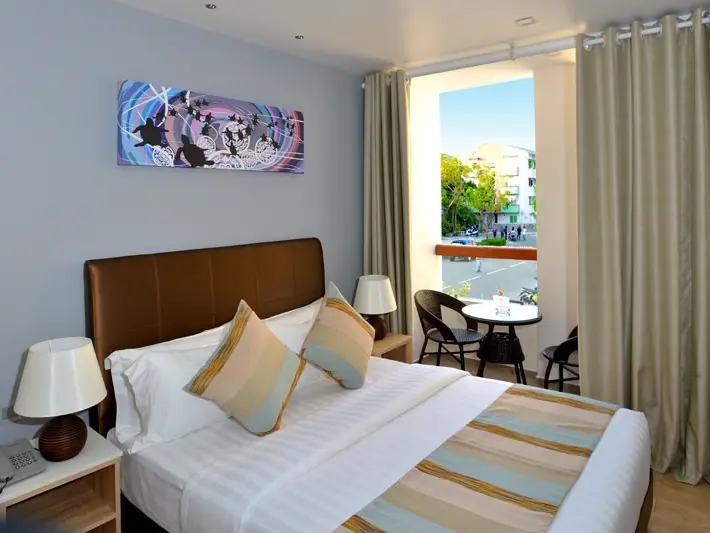 Het hotel biedt verschillende kamers met een moderne inrichting. Je ziet zeker de Maledivische accenten terug in de kamer. Kies voor de Comfort Room of de Holiday Room om helemaal tot rust te komen bij je verblijf. Reis je met je gezin? Het hotel beschikt over een Family Room waar je perfect kunt overnachten met een groep of met je familie. De Sky Suite biedt nog meer luxe. De suite beschikt over een privébalkon en een buitendouche en een bad. Alle kamers beschikken over een minibar, een kluisje, airconditioning, een televisie, thee/koffie faciliteiten en een haardroger.