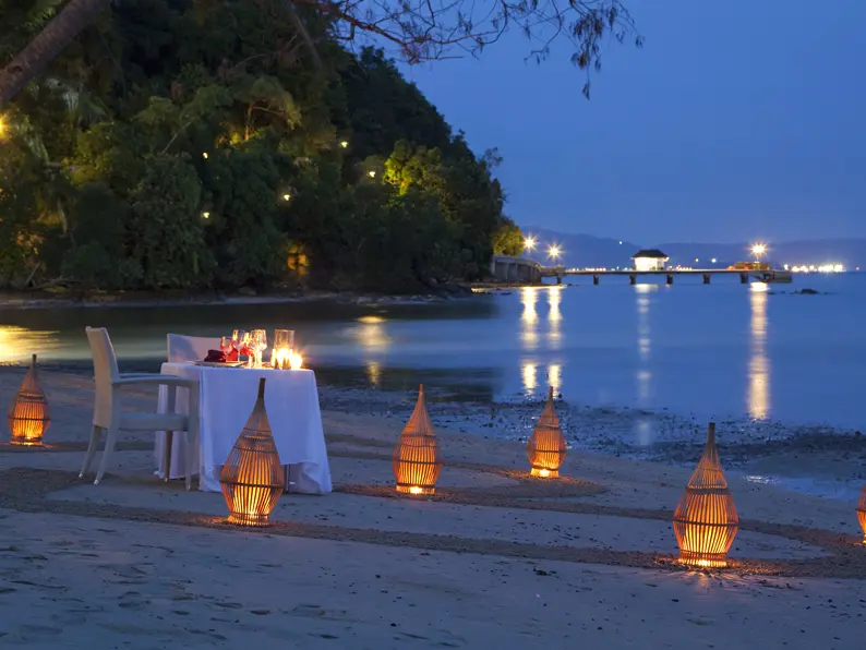 Op het privéstrand van het hotel kunt u in alle rust genieten. Er zijn wel mangroves voor de kust. Het resort beschikt ook over een boot waarmee u naar een strandje iets verderop kunt varen. Daar is het beter om te zwemmen en kunt u ook snorkelen.