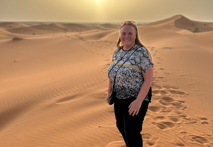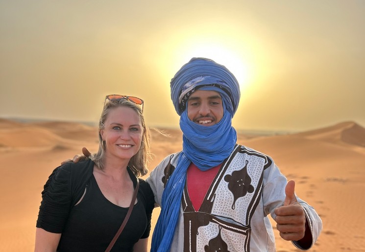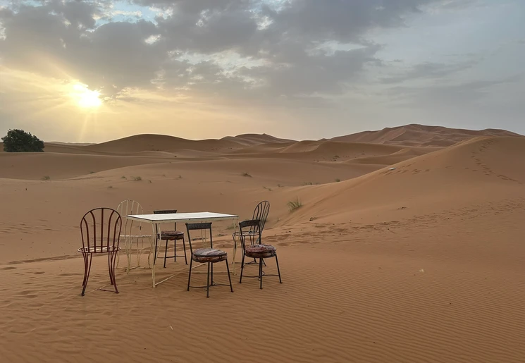 Het is een korte nacht want je moet al vroeg op voor de zonsopgang in de woestijn. Je stapt op je dromedaris en wandelt de zandduinen weer in. Als het helder is in de lucht, dan zie je de zon langzaam opkomen boven het geeloranje zand. Na een half uurtje ga je terug naar het tentenkamp. Daar staat het ontbijt al klaar. Na het eten neem je afscheid van de gidsen en brengt een fourwheeldrive je terug naar het hotel waar je auto geparkeerd staat.