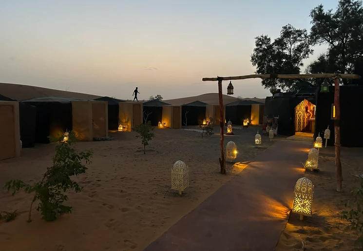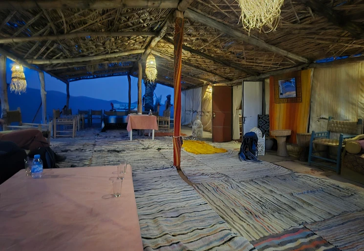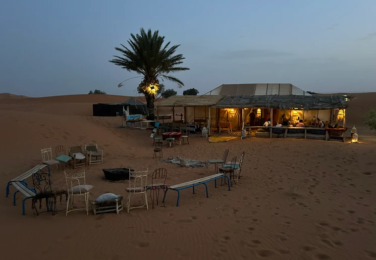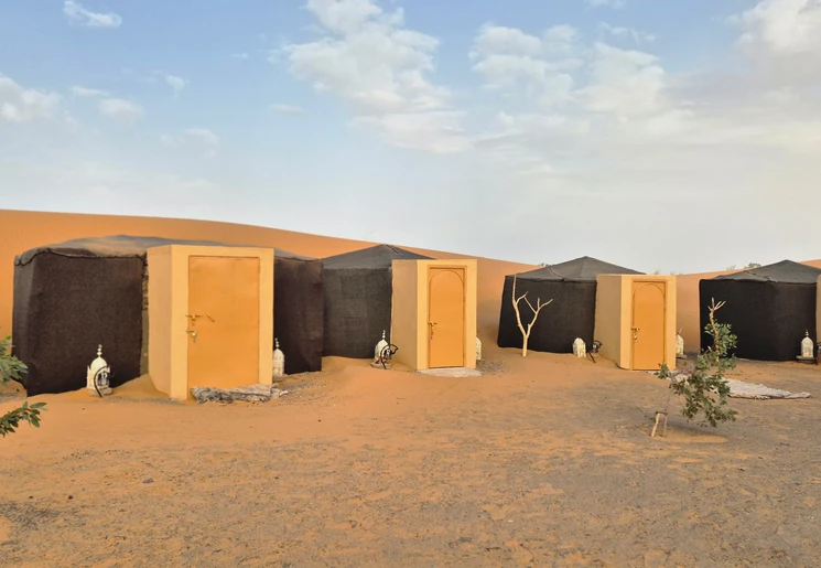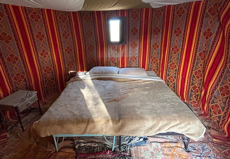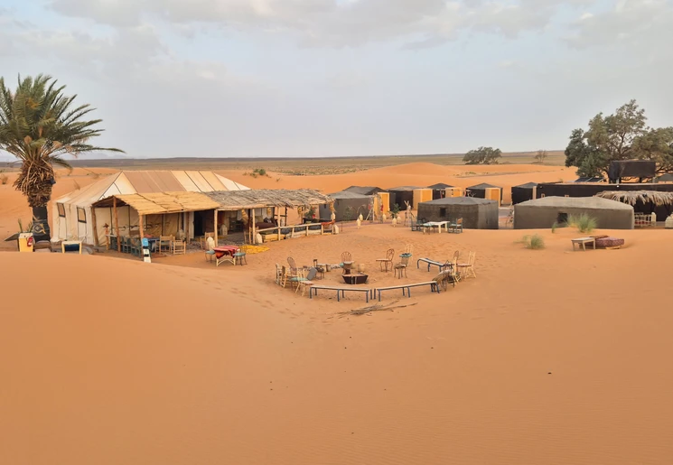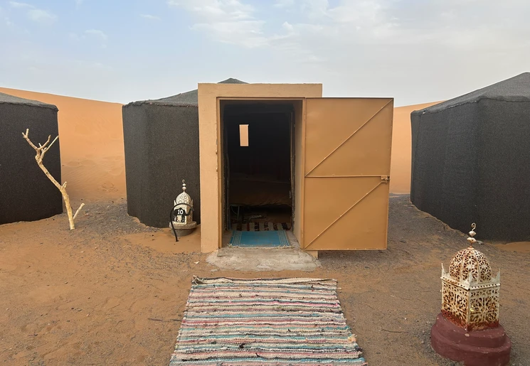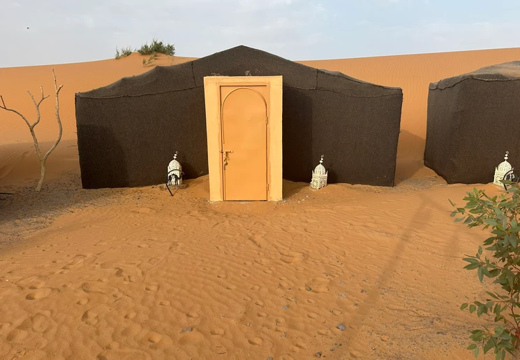 Het is eenvoudig, maar wel een bijzondere ervaring. Slapen in een tent in de Sahara. Je deelt het sanitair met andere reizigers.