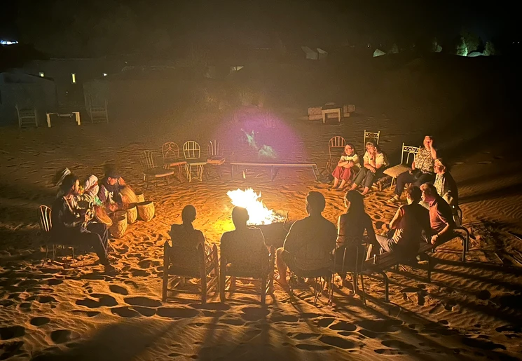 Na het aanmelden bij het hotel word je geregistreerd en hoor je hoe laat de tocht start. Jeeps brengen de deelnemers naar het beginpunt van de dromedaristocht. De gidsen staan met hun dieren op je te wachten. Je stapt op de rug van jouw dier en gaat op pad. Onderweg stop je om te genieten van de zonsondergang. Na het tochtje door de zandduinen rijd je naar het tentenkamp. In de centrale tent wordt kip of vegetarische tajine geserveerd. ’s Avonds is er lokale muziek bij het kampvuur. Deze excursie is samen met andere reizigers.