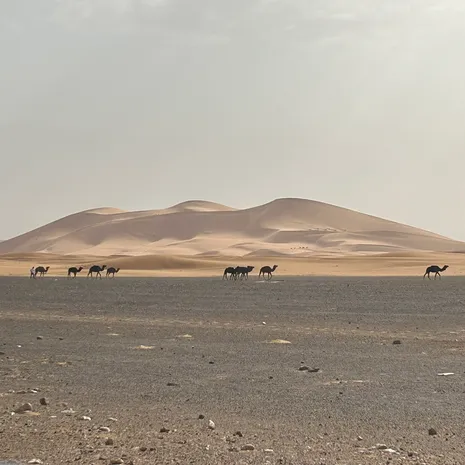 Wat een belevenis afgelopen nacht. Slapen in een tent in de woestijn! Het is alweer vroeg op vanmorgen want je gaat opnieuw op de kameel de woestijn in. Bij helder weer heb je hier een prachtige zonsopgang. Als de zon weer op is, loopt de kameel terug naar het tentenkamp. Je gaat ontbijten en daarna rijd je weer terug naar het hotel in Zagora.