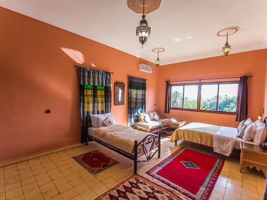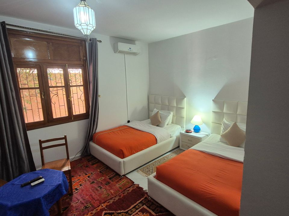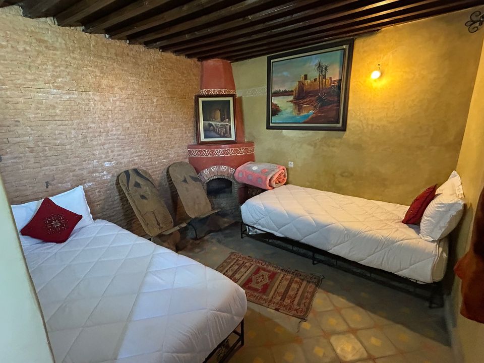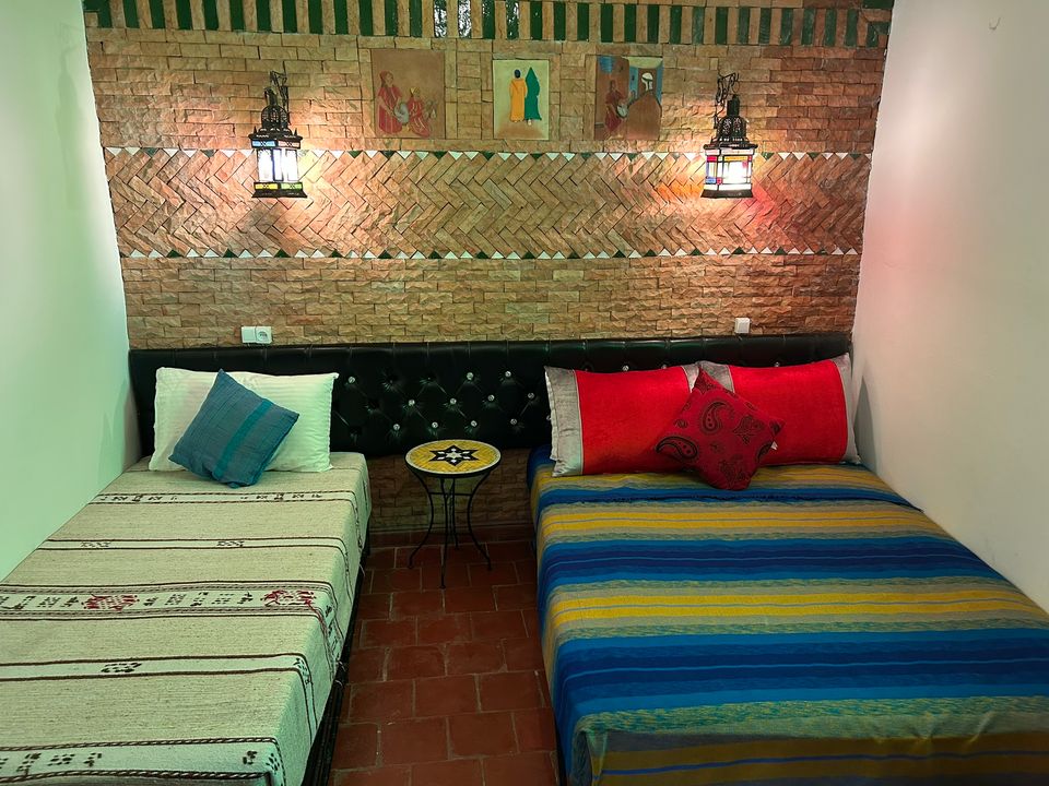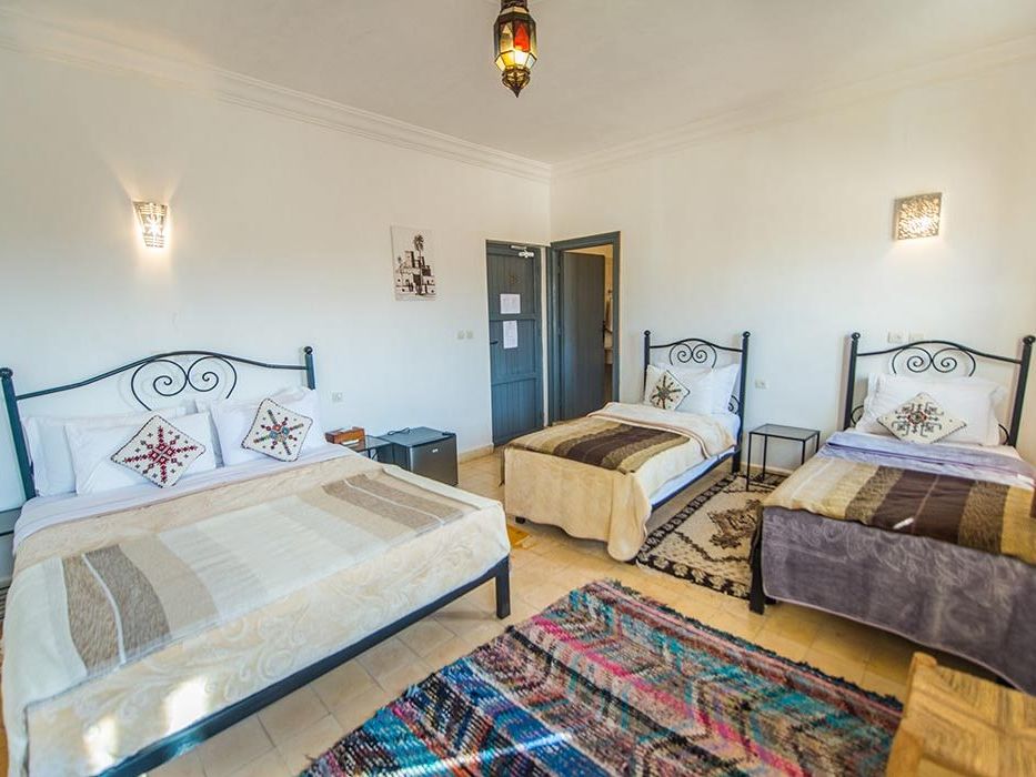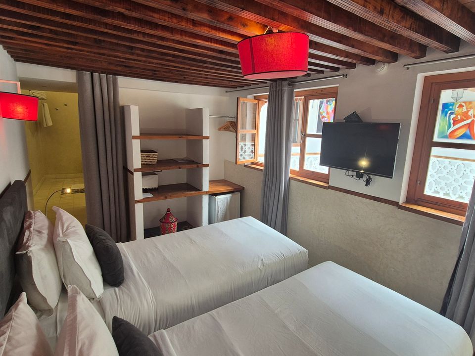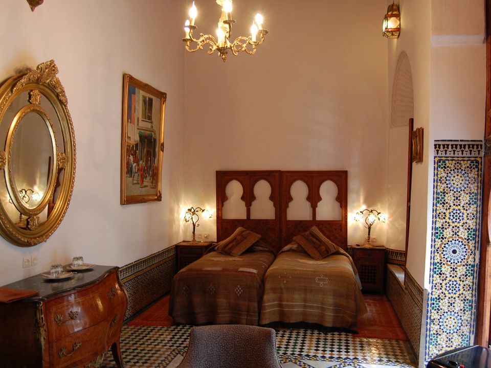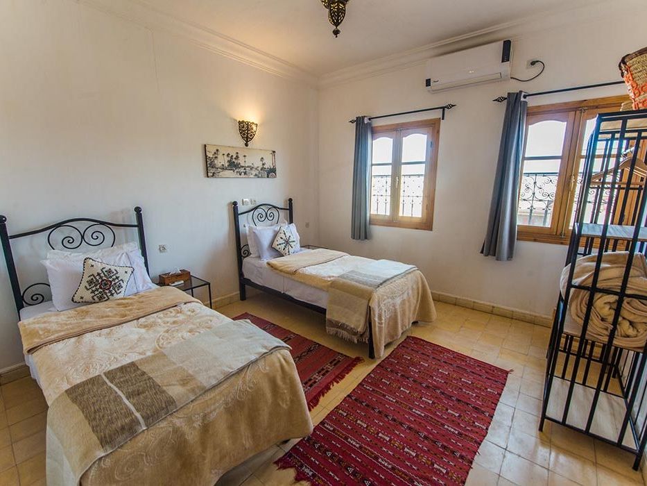 Médersa Room: tweepersoonskamer (36 m2) met twin beds. In deze kamer is ruimte om 1 of 2 extra bedden te plaatsen, waardoor de kamer geschikt is voor 3 of 4 personen. De badkamer beschikt over een douche.